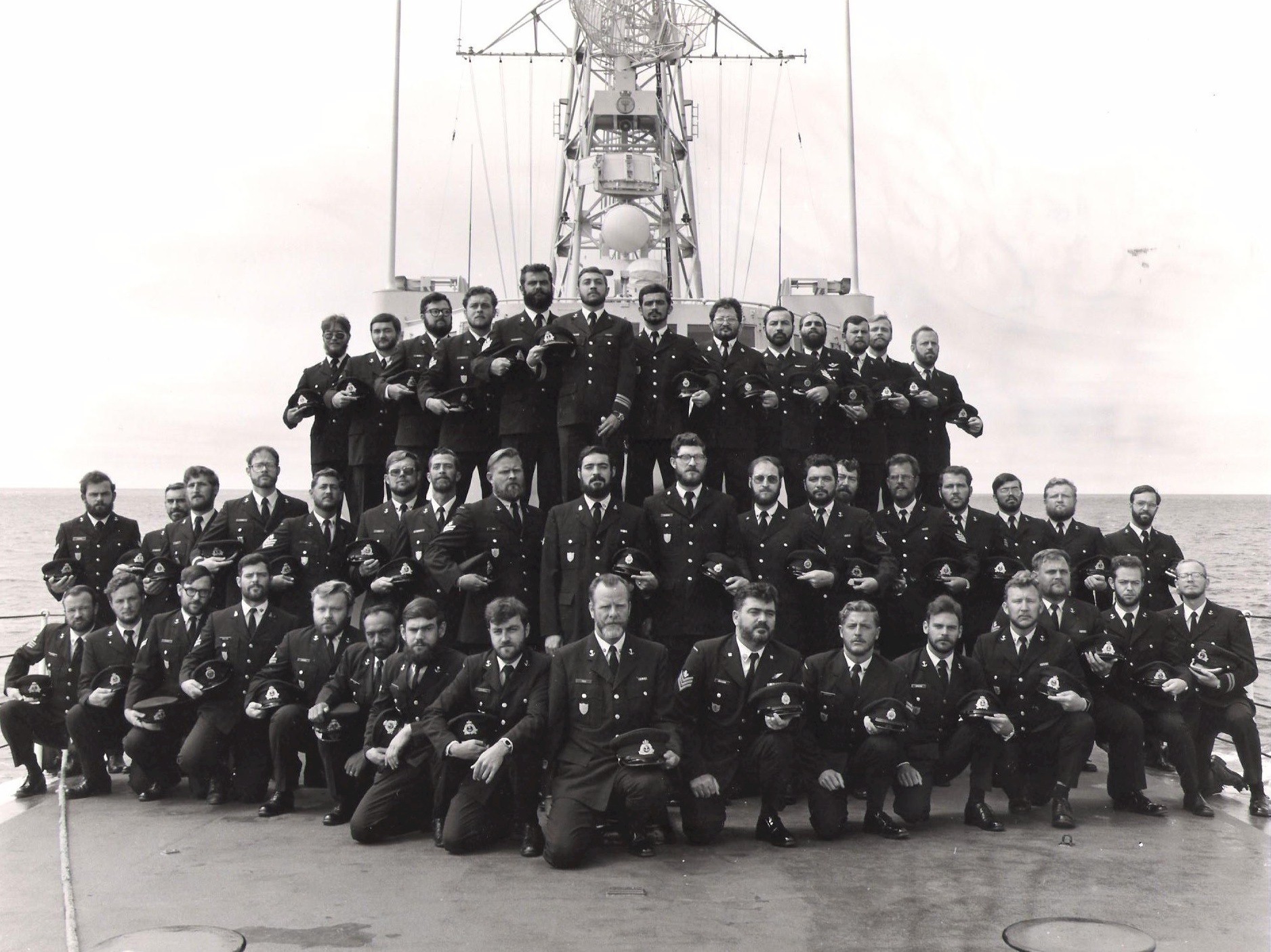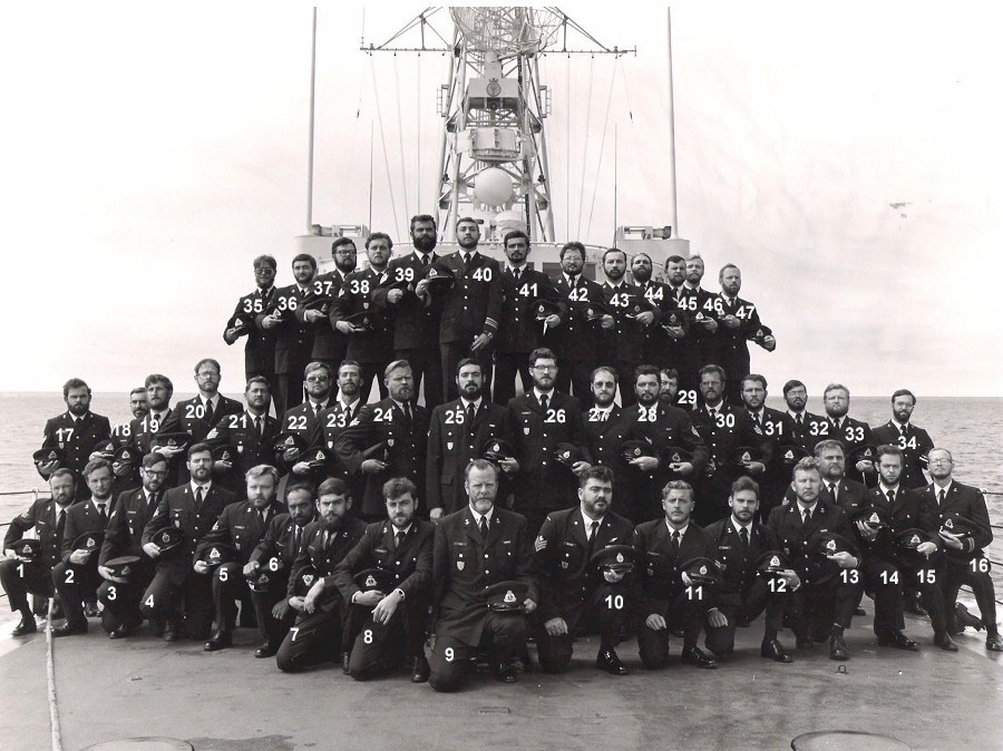 (1) PO2 Sutherland (2) AB B. Stuart (5) MS L. Gjesdale (6) PO2 Flack (7) LS B. Bouvet (9) PO R. Falk (10) SGT W. Bradshaw (11) AB D. Shipalesky (12) AB R Johnston (13) PO D. McCoy (14) MS E. Davis (15) LS Zimmer (17) LS J. Osbourne (18) PO2 Griffiths (20) Lt Stewart (21) PO E. Lee (22) PO2 Parker (23) PO W. Harkness (24) MS Gale (25) MS G Johnston (28) PO P. Hill (29) MS Brown (30) PO M. Wierenga (31) PO R. Dallin (33) AB Flavelle (34) LS Taylor (36) LS P. Peachey (39) PO2 Francis (40) LCdr Foldesi