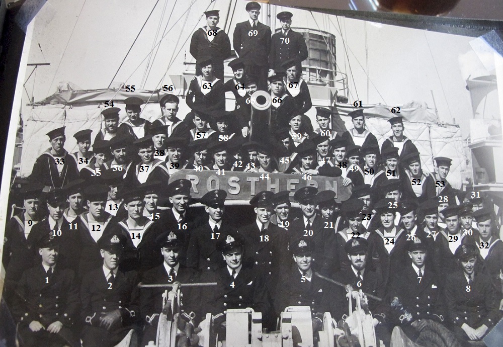 (1) Paterson, James Ross, CPO ERA (3) Baldwin, Arthur Hales, Lt, RCNVR (4) Davies, Berwyn, Lt (5) Annett, Sydney Reginald Phillips, Lt, RCNVR, CO (16) Dunn, Robert, PO (22) Easton, William (Bill) (24) Wilson, John (Tug) (25) Chisholm, Richard Stanfield (30) Coffin, David Albert, Ck (43) Downie, Ivan Dunbar (51) Crompton, Joseph Samuel (55) Williams, Orville (57) Gard, Ray (65) Kirby, Reginald James (66) Mackisoc, Victor, L/Sig (76) Ouellette, Edouard