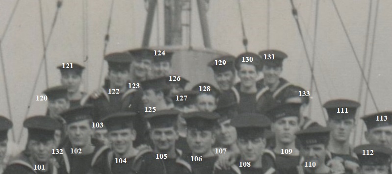 (8) Hanbury, Ross M., LCdr, RCNVR, CO (10) MacBeth, Jack, Lt, RCNVR (12) Sawyer, Roy, PO (57) McLoughlin, James (63) Bishop, Cecil (67) Ayre, Norman Frederick, RCNVR (72) Mallette, Raymond Alfred, Tel (R), RCNVR (83) Woods, F. Reginald, Sig (86) Howe, Morris Iver (107) Marklinger, John Allen (109) MacPherson, John Stewart
