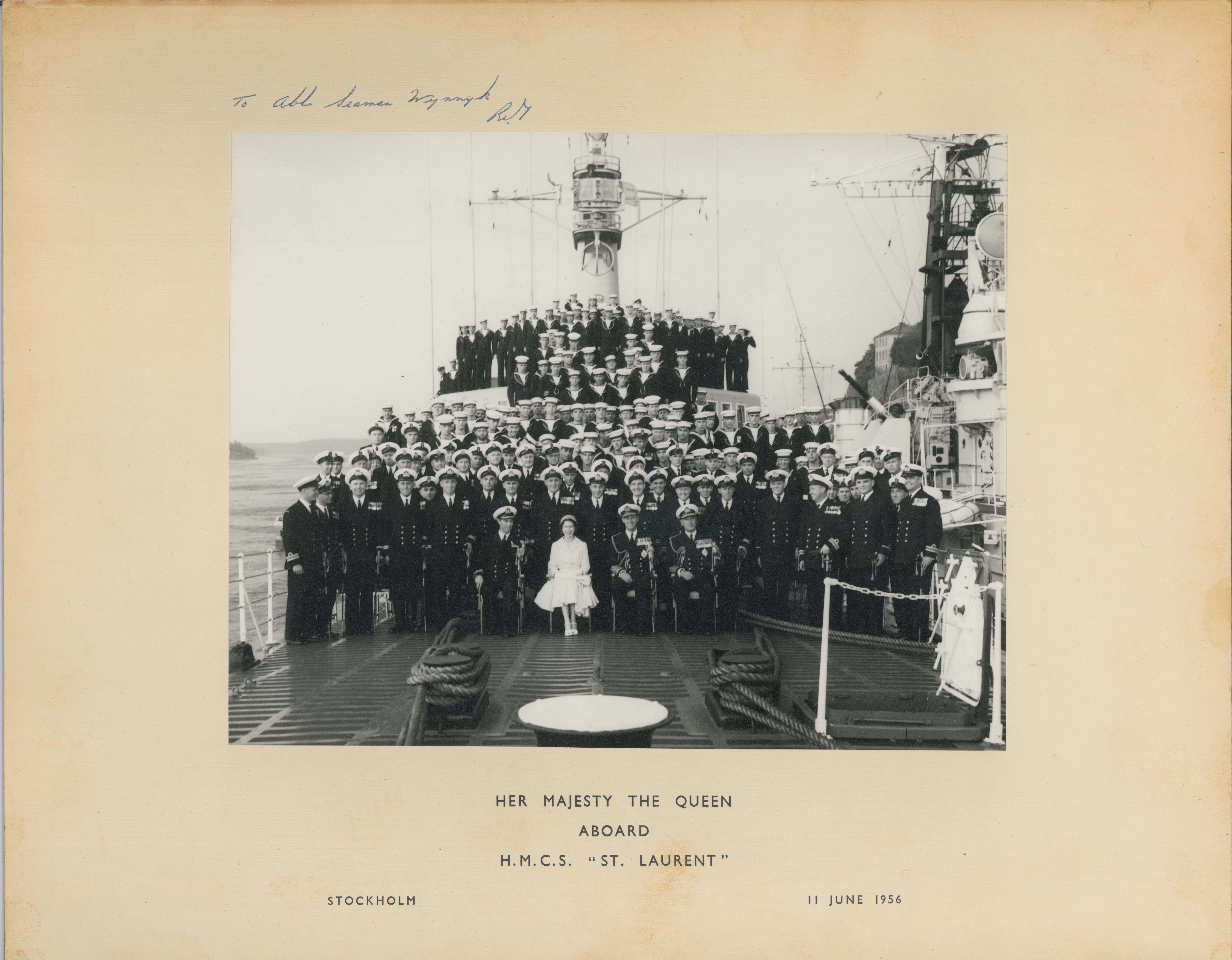 HMCS ST LAURENT 205 Queen Elizabeth II with the crew of HMCS St. Laurent in Stockholm, Sweden, 11 Jun 1956 Click on the above photo to view a larger image