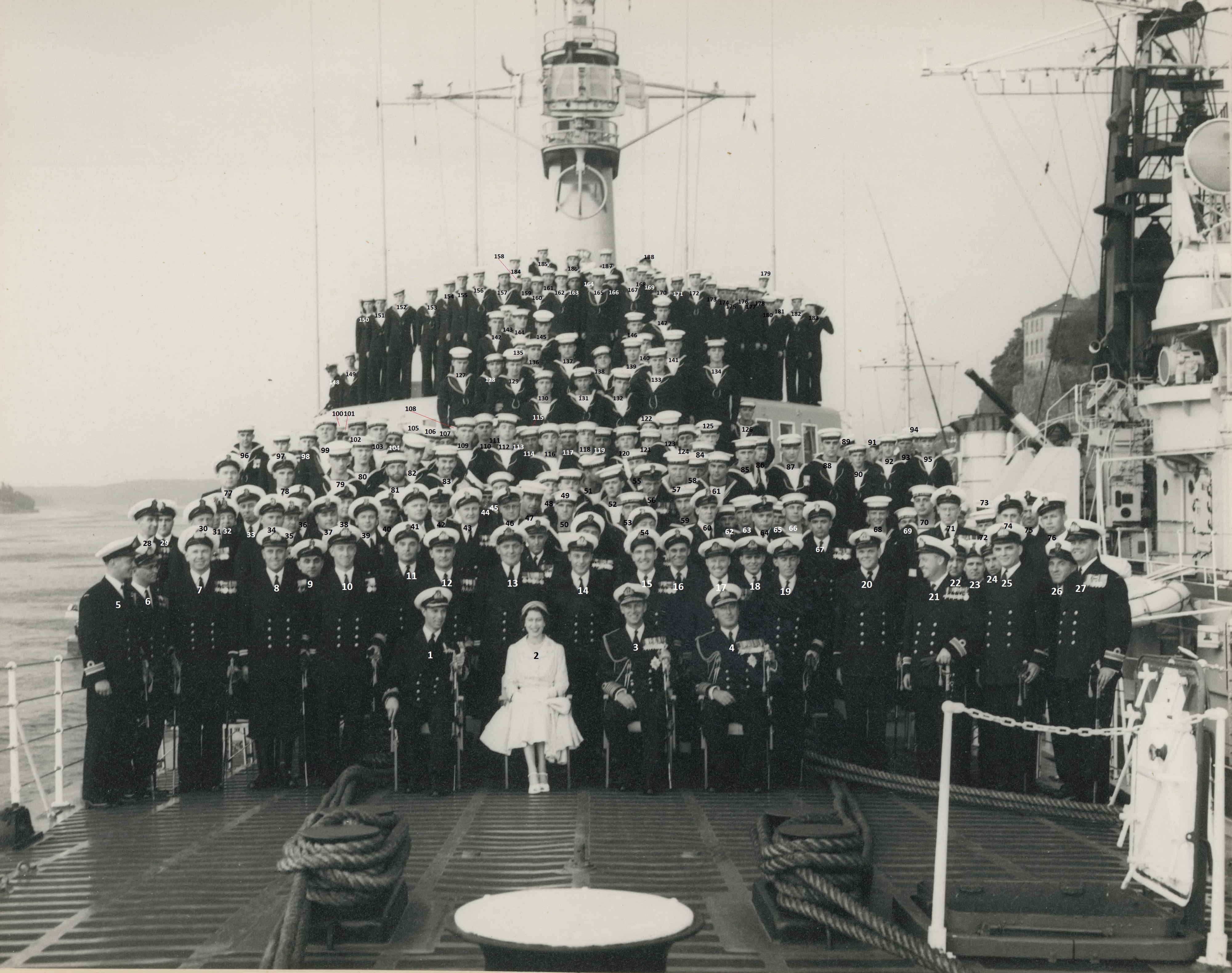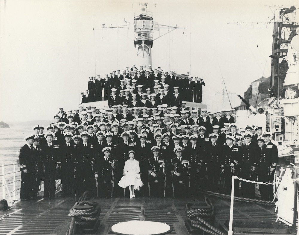(1) Cdr Robert Timbrell, CO (2) Queen Elizabeth II (3) Prince Phillip (4) Lord Louis Mountbatten, Admiral of the Fleet and First Sea Lord