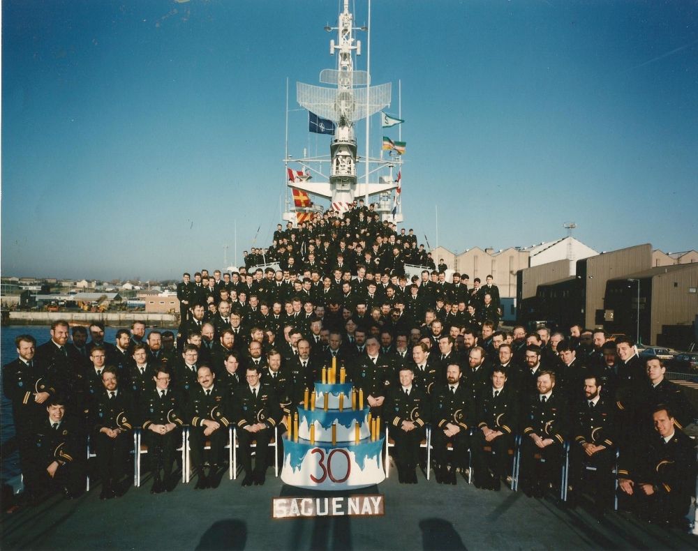 HMCS SAGUENAY 206 30th Anniversary crew photo at the shipyard in Rosyth, Scotland, December, 1986 Click on the above photo to view a larger image