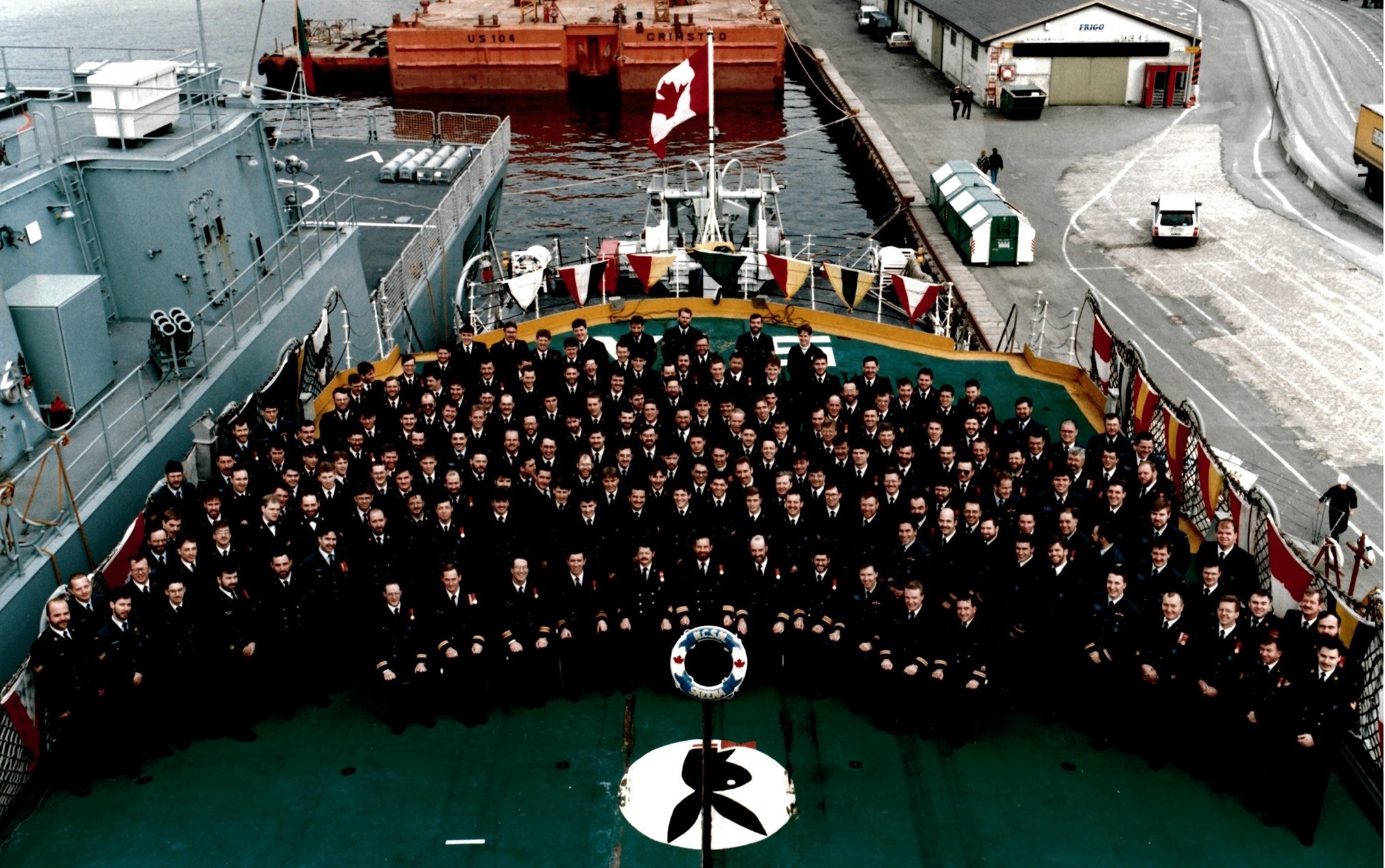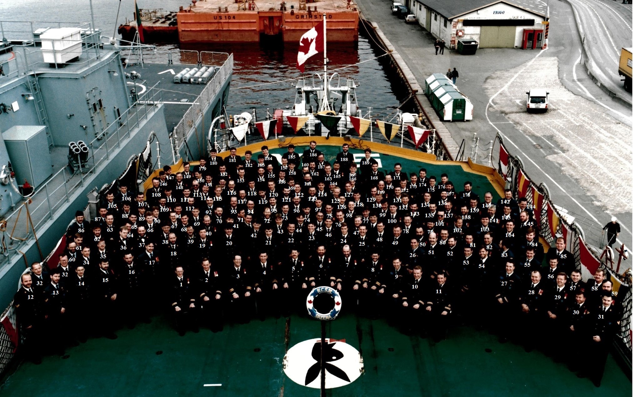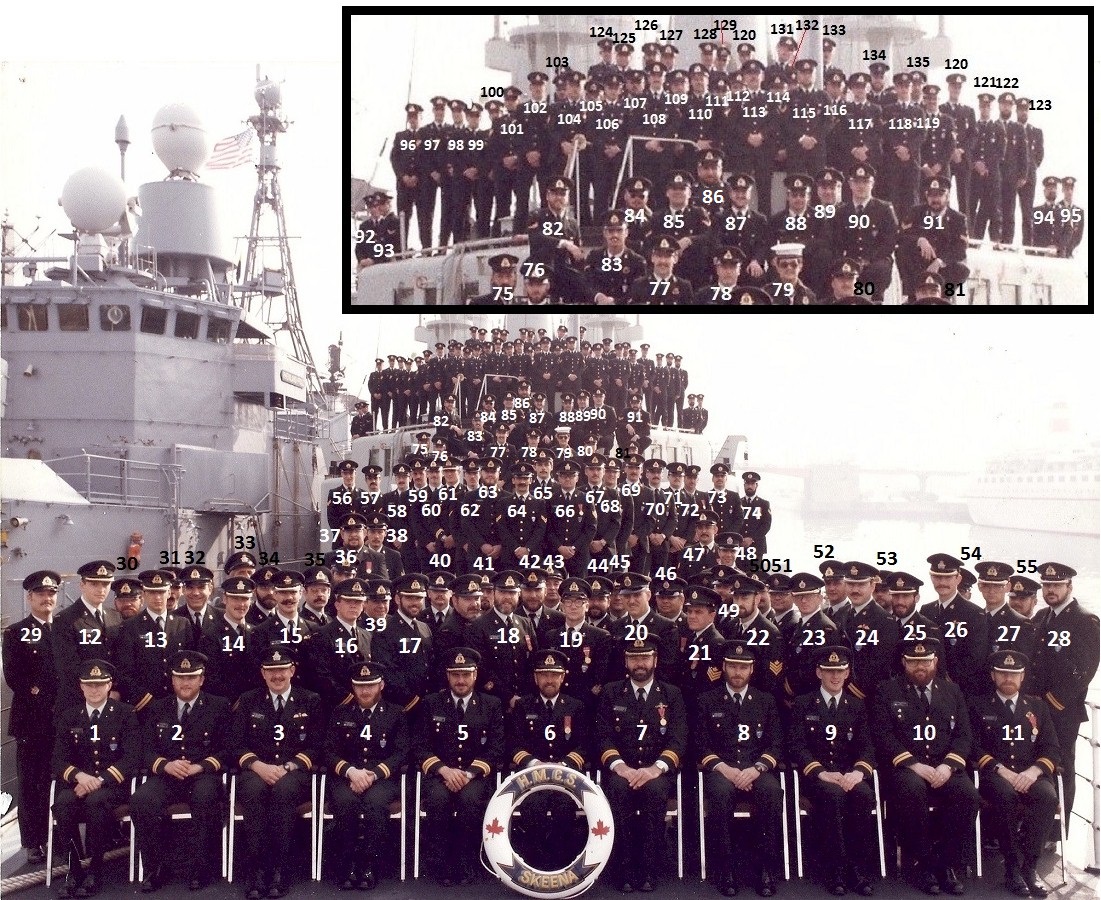 (2) Hendry, Lt (N) (3) Sweetman, Wally, Capt, Air Det Cdr (6) Foldesi, I., Cdr, CO (7) Perusse, Andre, LCdr (14) Lawson, Steve, Lt (15) Tardiff, Claude, Capt. (11) Desnoyers, Lt (N), EO (18) Caliquette, C2ERR, CERA (19) Baril, Marcel, CPO1, Cox'n (24) Sawatski, Capt, Air Navigator (25) Smith, Alex, Air Navigator (26) Marquis, Paul, Lt (30) Robichaud, P1ER (33) Boucher, Bob, MWO, Air Det Chief (34) Matte, P2ER (35) Roy, P1ER (36) Tyler, P1ER (37) Wong, Dave, P1ER (39) Rochon, P1ER (46) Leclerc. MWO, Chief Cook (47) Wong, P2SN (54) Gagnon, Louis, Med A, (Sickbay Tiffie) (62) LeBouthillier, Marc, AB (66) Cameron, Alvin Clark (aka Chilly) (77) Richard, Pierre (103) Boulanger, Pat (possibly)