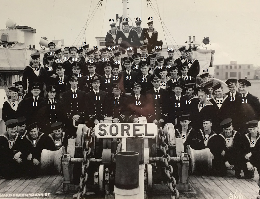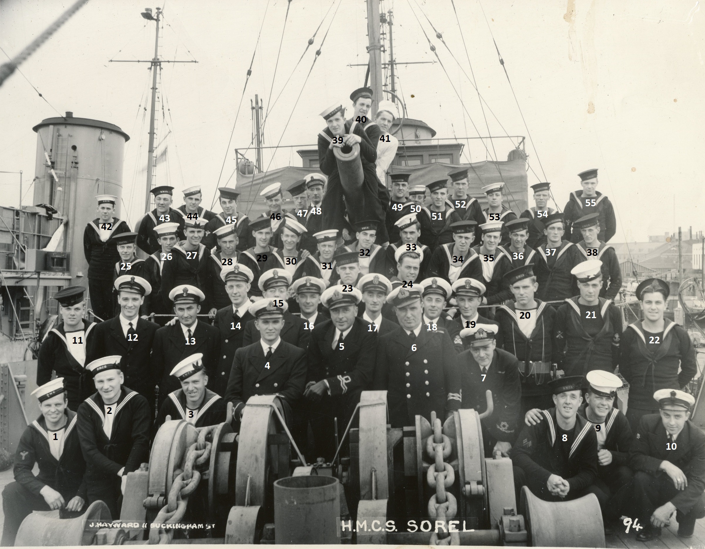 (25) McGlaughlin, Jock, L/Sto (of Toronto, ON) (26) Brown, H., A/LS (of Ottawa, ON) (27) Dowsette, L., AB LR3 (of Vancouver, BC) (28) Burgess, Ira, AB (of NS) (29) Ivy, Bill, A/LS WT3 (of Toronto, ON) (30) Howarth, Charlie David., AB, SD (of Calgary, AB) (31) Auby, G., A/LS Sig (of Halifax, NS) (32) Kirk, Al, AB SD (of Montreal, QC) (33) McLeod, Calum, AB LTO (of Fort William, ON) (34) Ayling, Wally, AB ST (of Kingston, ON) (35) Hulbert, John (Jack) Tel (of Toronto, ON) (36) Ware, William John (Johnny), AB (of Montreal, QC) (37) Jacques, Rene, OS (of Montreal, QC) (38) Vigneault, OS (of Quebec, QC)