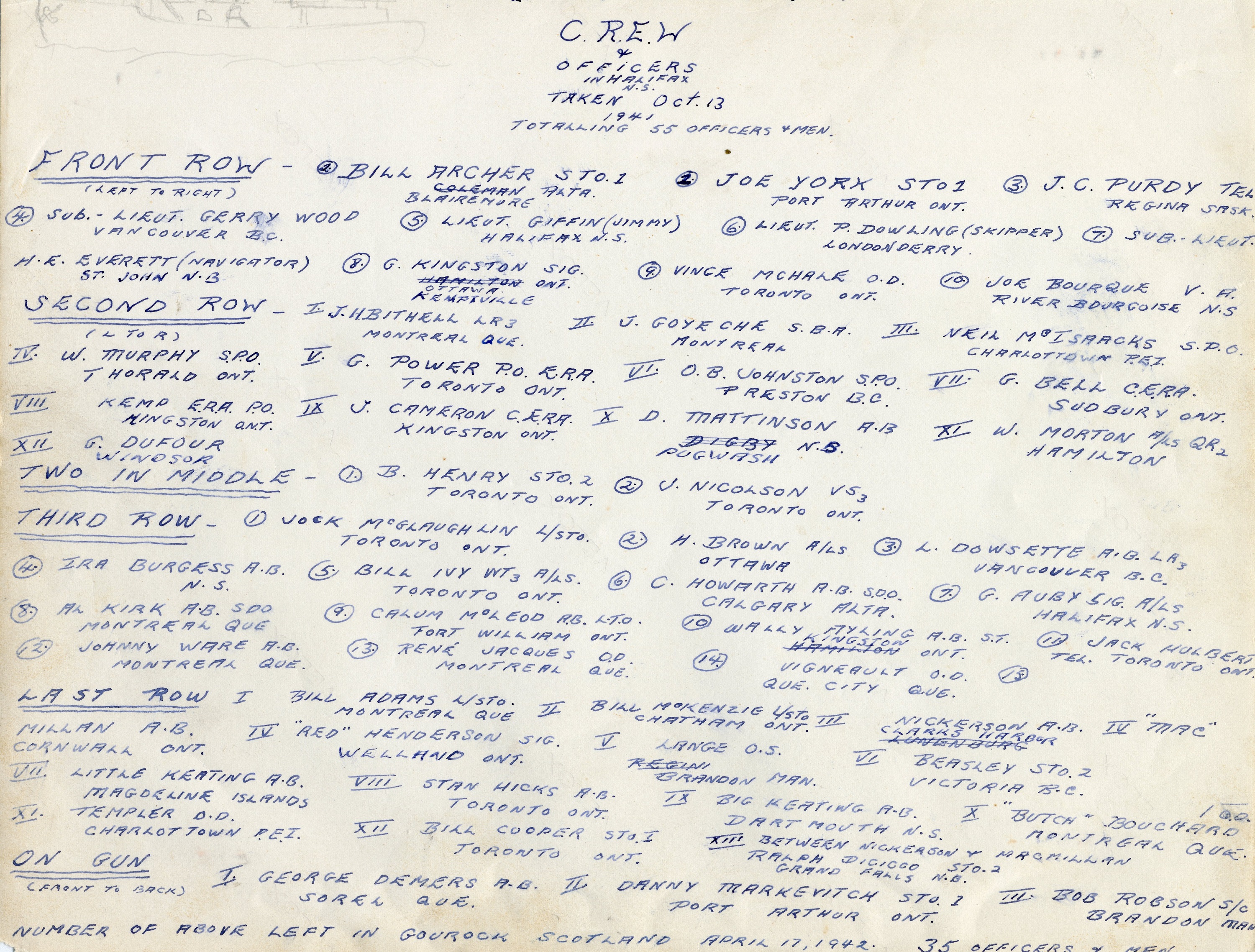 (1) York, Joe, Sto 1c (of Port Arthur, ON) (2) Archer, Bill, Sto 1c (of Blairmore, AB) (3) Purdy, J.C., Tel (of Regina, SK) (4) Wood, Gerry, SLt (of Vancouver, BC) (5) Giffin, Lt (Jimmy / 1st Lt) (of Halifax) (6) Dowling, P., Lt (CO) (of Londonderry) (7) Everett, H.E., SLt, Navigator (of Saint John, NB) (8) Kingston, G., Sig (of Kempville / Ottawa, ON) (9) McHale, Vince, OS (of Toronto, ON) (10) Bourque, Joe, VA (of River Bougoise, NS)