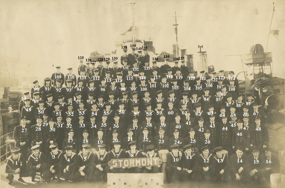 (17) Whiting, G., SLt, Torpedo Officer (18) Gray, W.D., Lt, Navigating Officer (19) Taylor, W.R., Surg-Lt, Medical Officer (20) Saunders, D.H., Lt, 1st Lt (21) Myers, G.A., Skipper-Lt, Commanding Officer (22) Smith, B.K., Lt (E), Engineer Officer (23) Watson, W.W., Lt, Gunnery Officer (24) O'Heard, W.D.A., Lt, A/S C.O. (25) Butler, E.U. Lt, Signal Officer (26) Campbell, P.D. SLt (E), A/Engineer Officer