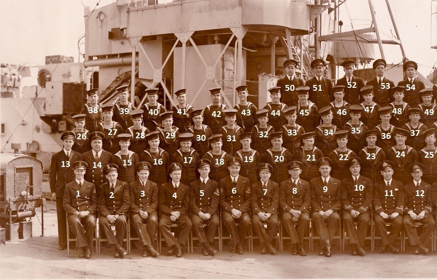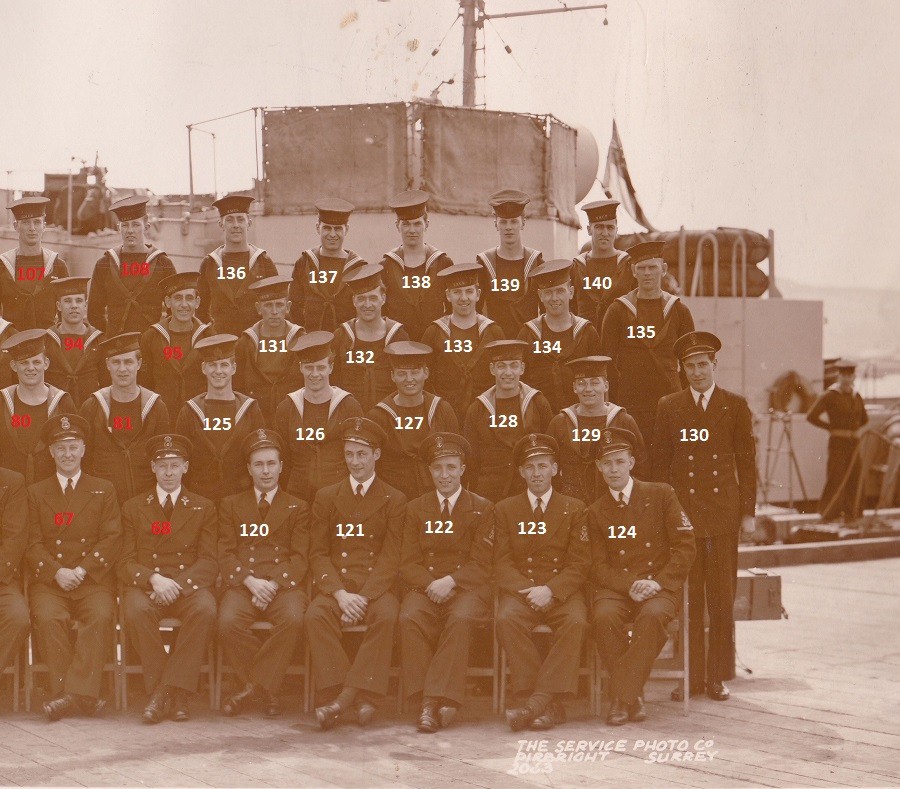 Section 2 Click on the above photo to view a larger image (56) Barclay, Frank Berthon, Lt, RCNVR (57) Leeming, John McWhannel, Lt, RCNVR (60) Burgis, Charles William, Lt, RCNVR (77) Russell, Gordon Ian (78) Gray, William Lorne (108) Beale, Harry William (111) Lentinello, Augustine (113) Montgomery, Hugh John
