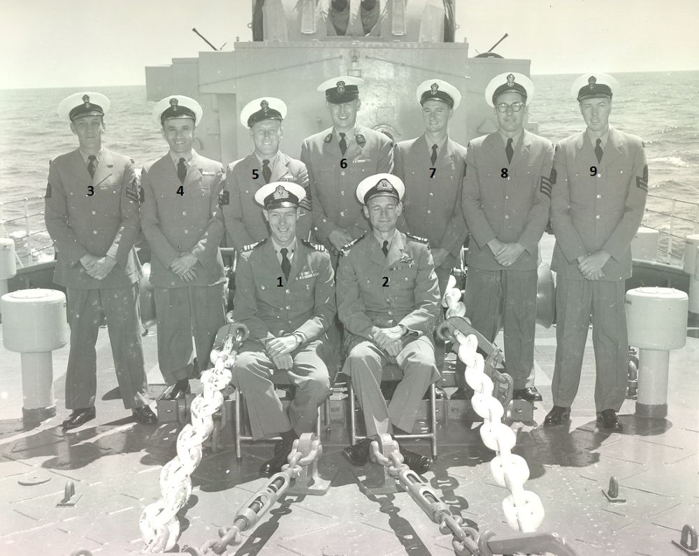 HMCS SUSSEXVALE 313 - c1962 (1) Turner, Anthony N., LCdr (2) Joy, Henry D., LCdr (3) Broster, G.A., PO.RP (6) Cooke, Ron, C2.RP (7) Colclough, Fred, PO.HT (8) Wright, James Edward (9) Garrioch, R., PO.ET From the collection of Gordon Arnold (Art) Broster Courtesy of Cathy Robinson