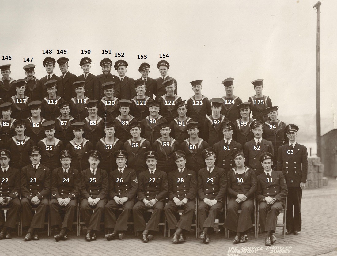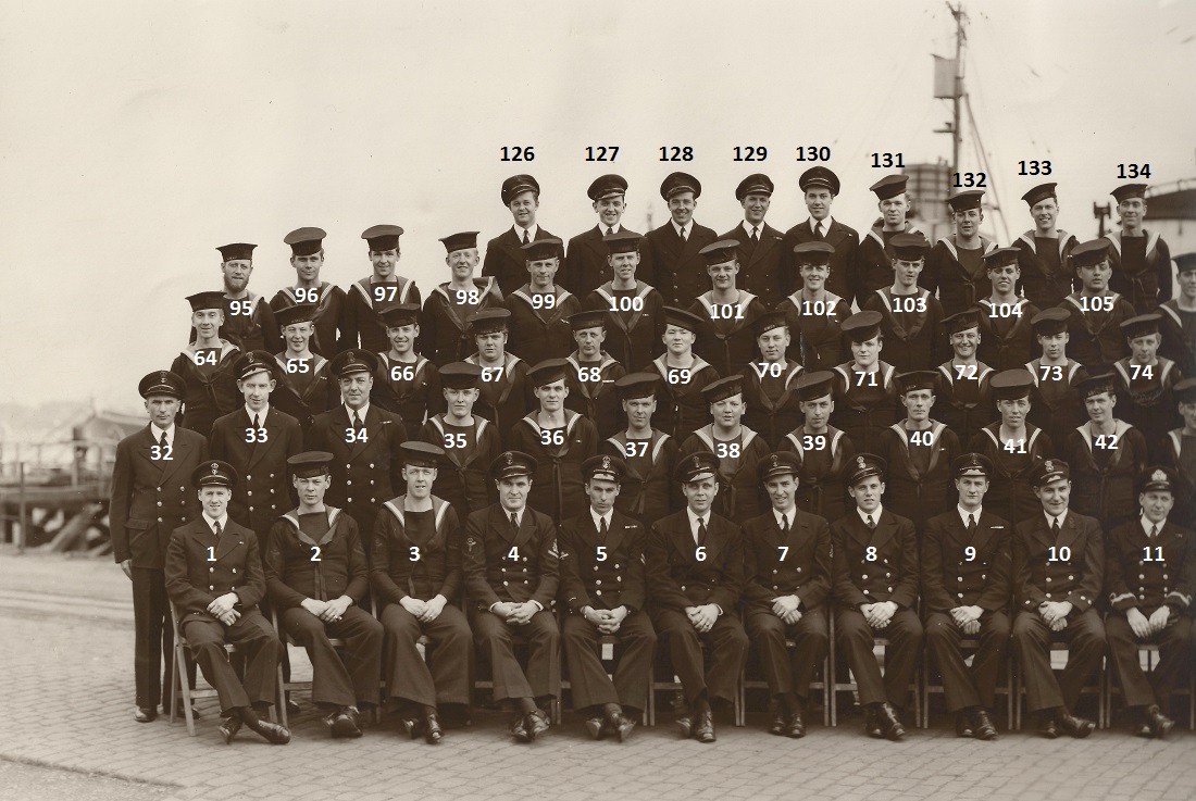 (11) Harris, George Walter (15) Pimlott, Douglas Humphreys, Lt, RCNVR (16) Allan, John Alfred Roberts, LCdr, DSC, C.O. (17) Berry, Arthur (20) Waller, Dalton, Gunnery Officer (22) Donahue, John Joseph, Electrical SLt, RCNVR (44) Grigg, George Walton (48) Campbell, Duncan Hugh (53) Lyon, John Davie (Jack) (76) Gawthrone, Frank Harold (78) Marr, Stewart William (79) MacIsaac, A.D. (82) Richardson, Douglas Lyle, Tel (104) O'Grady, John Wesley (105) Dedul, Jacob Peter (109) Cole, Charles George (110) Biggers, Ronald (114) Stewart, Ira (116) Rivers, Noel B. (136) Simmons, Frank Arthur (141) Gauthier, Fernand (143) Levesque, Abby/Abbie, Sig (of Montreal, QC) (145) McEwan, Hugh Patrick (Toddy)