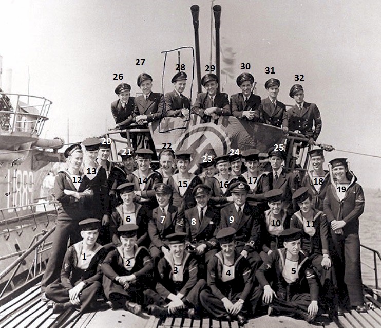 U-190 with RCN crew berthed outboard of U-889 Click on the above photo to view it without numbers (1) G. Gray (2) E. T. Crowley (3) R. C. Foster (4) E. Deadman (5) R. Tipple (6) R. Sparks (7) E. Jones (8) D. W. Pope (9) K. G. Tryon (10) L. Oliver (11) R. W. Addell (12) G. Larking (13) D. S. Currie (14) B. Alexander (15) A. Muruca (16) L. Gillham (17) R. Kerr (18) E. Rogerson (19) T. W. Dennis (20) B. Merriman (21) MacMillan (22) T. W. Burbrick (23) F. Gavin (24) D. Wilsie (25) J. Newsome (26) J. A. Bond (27) J. Peacock (28) G. Benham (29) H. F. Rodwell (30) J. Lusher (31) D. A. Boyce (32) R. Arsenault Not in photo: Lt. R. McKenna, F. Fryer, J. Moffat Webmasters Note: due to the way people are standing, in the 3rd and 4th rows, it is possible that # 18 and #25 are mis-labeled.
