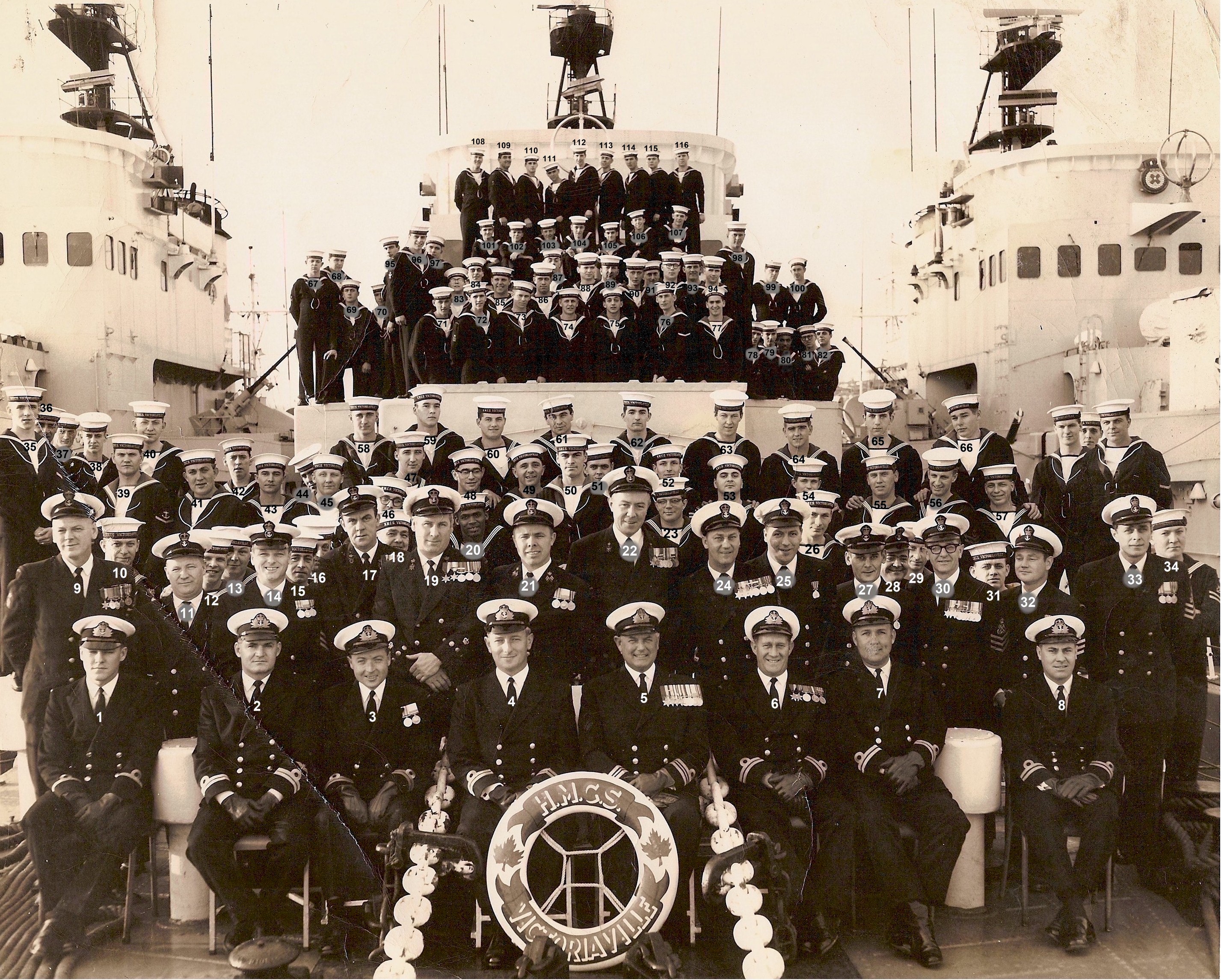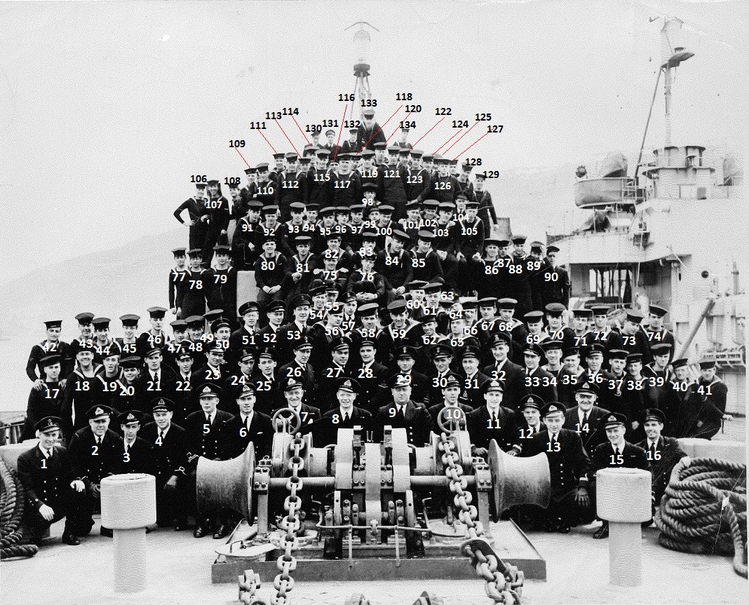 (3) Graham, Donald Vye, Surg-Lt, RCNVR (9) Hickey, Lester A., A/LCdr, RCNR, CO (25) Curts, Alexander, A/Sto PO (27) Bertuzzi, Peo (Bert), CPO (44) Metcalfe, Harold Roy (Hal), AB, RCNVR (68) Stone, Robert Philips, AB, Radar, RCNVR (69) Henderson, Geoffrey, Tel (75) Bourgie, Marcel (76) McInnes, Douglas Glenson (81) Ferroni, Armand (101) Wendell, William Lee (113) Ruckle, William George (Bill)