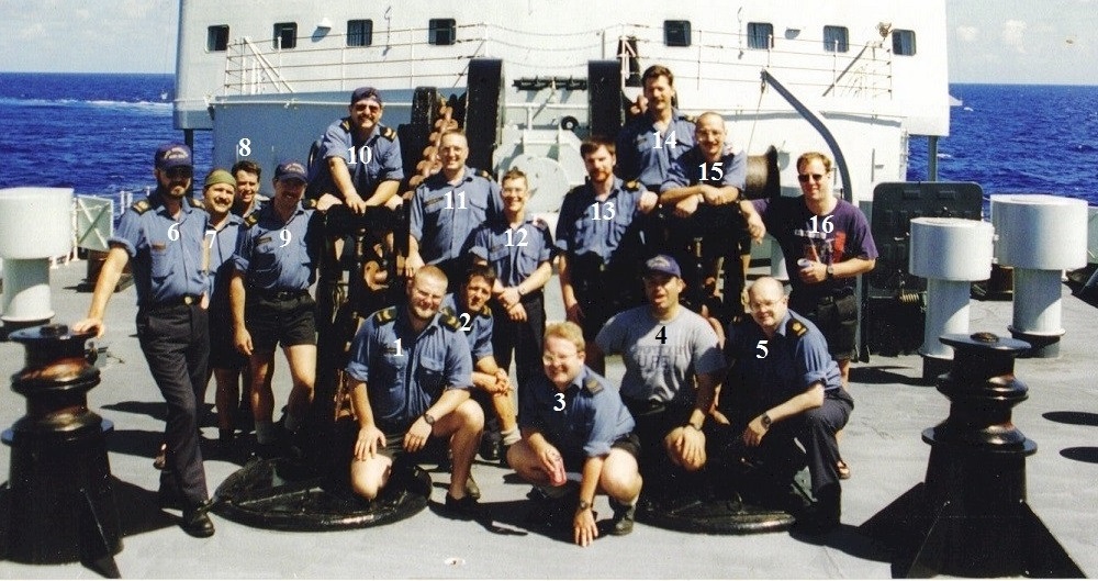 (8) Haines, Dave, PO2 NWT (9) Fewer, Terry, PO2 NET(T) (10) Gatenby, PO2 NWT (11) Sharpe, Tom, PO2 NWT (12) McDougall, David, LCdr, CSE Officer (13) Raymond, Russ, PO2 NWT (14) Albert, LS NWT (15) McNeil, MS NWT (16) Menard, AB NWT