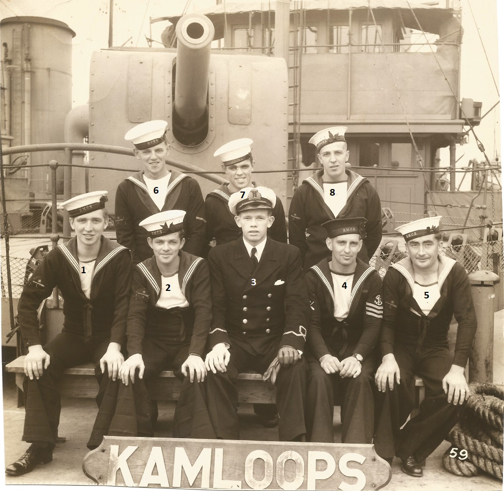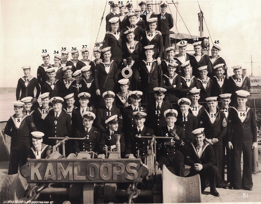 (3) Denny, Thomas G., Lt, RCNVR (6) ship's mascot (9) Duncan, James Alexander, PO (36) Malley, Edward (Ted), Tel (40) ship's mascot (44) Allen, Hugh Gordon