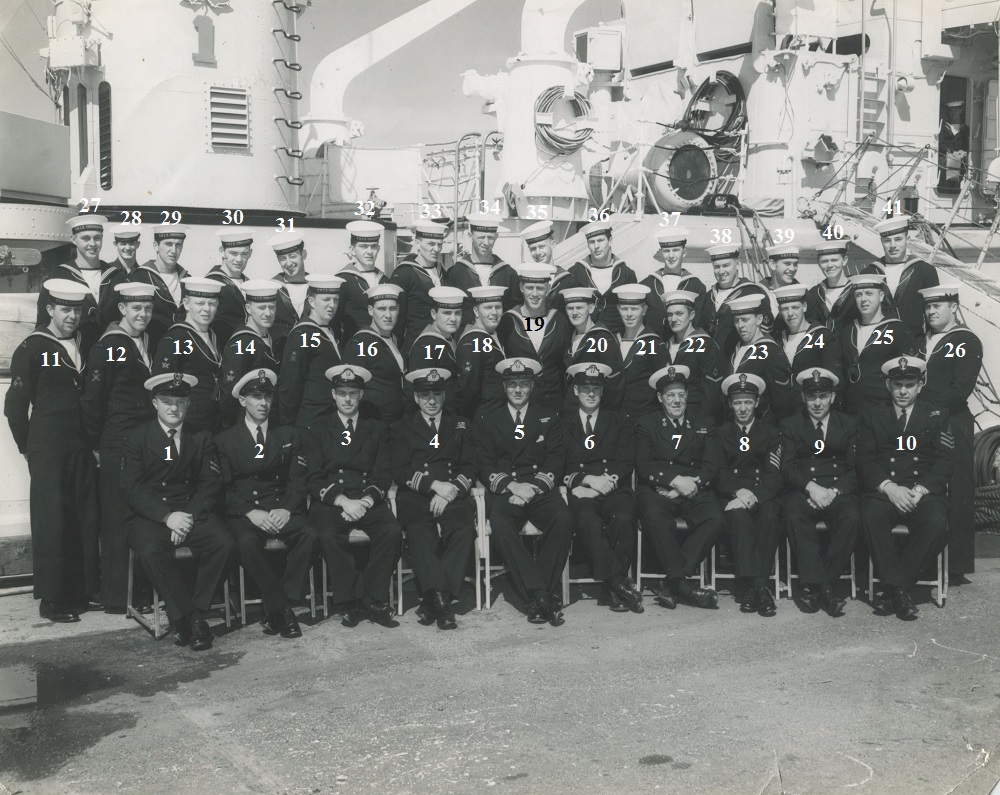 (1) Graville (Gravel Gerty) (2) Jeffery (Jeff) (3) La Gallas, SLt (4) Greco, LCdr (5) Manor, John Irwin, LCdr, CO (6) Rushton, Lt (7) Irving, Chief (8) Juilian (Big Julie) (90 Roscoe, Bill (10) Martin, Ralph