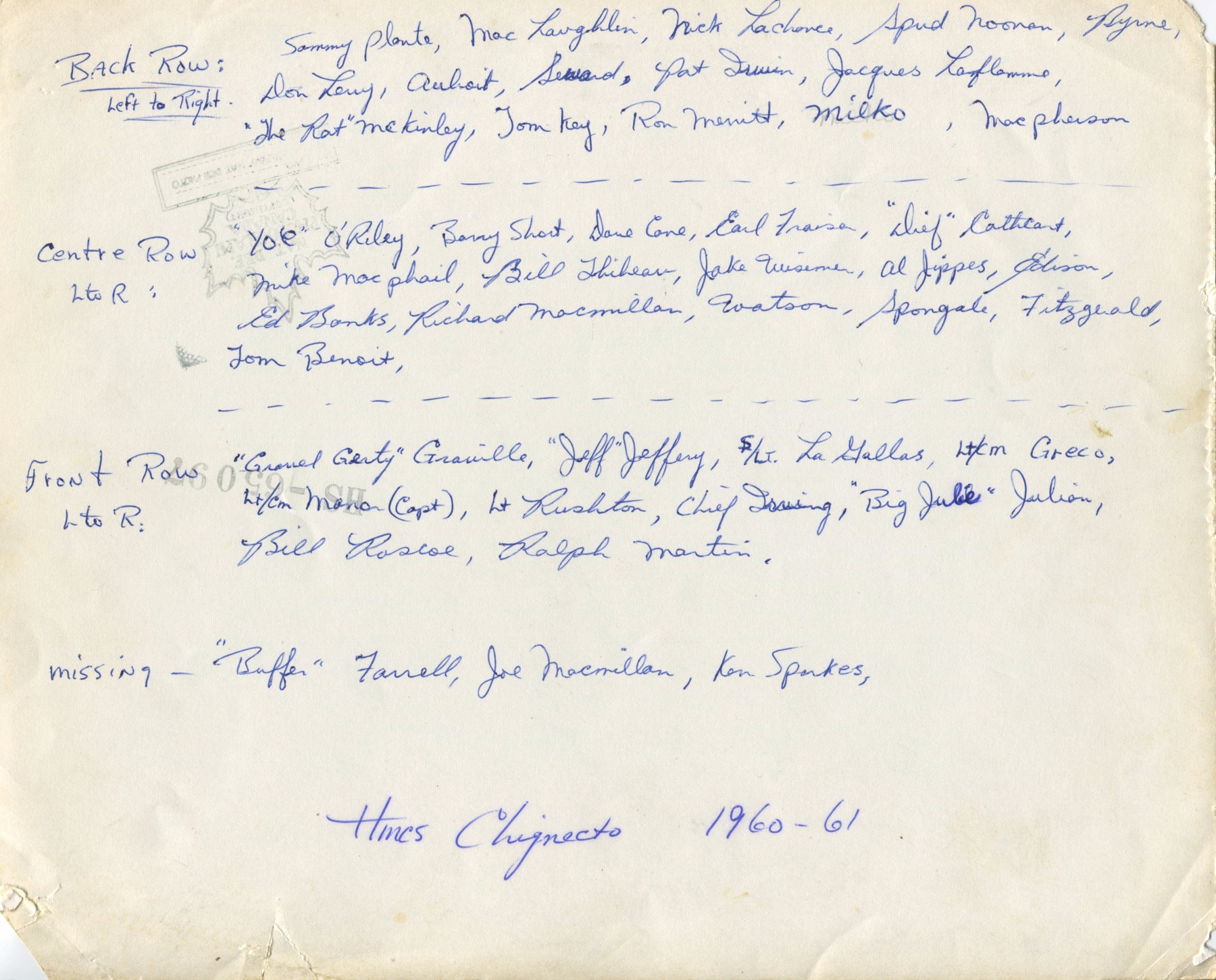 (11) O'Riely (Yoe) (12) Short, barry (13) Cane, Dave (14) Fraiser, Earl (15) Cathcart (Dief) (16) Macphail, Mike (17) Thibeau, Bill (18) Wisemer, Jake (19) Jippes, Al (20) Edison, William (Bill) (21) Banks, Ed (22) Macmillan, Richard (23) Watson (24) Spongale (25) Fitzgerald (26) Benoit, Tom