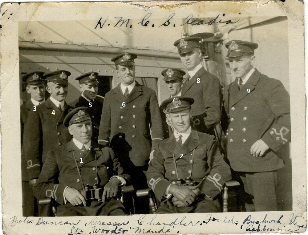 (1) Wood, Herbert Henry DeLally, Lt, RNCVR (2) Maude, George, Lt, RNCVR (3) Duncan, Walter C.C., W. Op 3c, RCNVR (4) Chandler, William R., Mate, RNCVR (5) Dresser, James S., Mate, RNCVR (6) Foulds, Frank Bertram, Mate, RNCVR (7) Bushwah (1) (8) Stevens, Reginald Garnet, Mate, RNCVR (9) Ashbourne, Elmo L., Mate, RNCVR