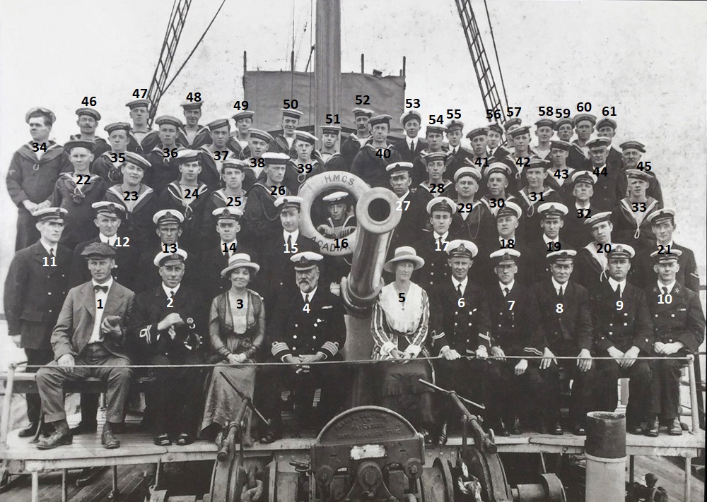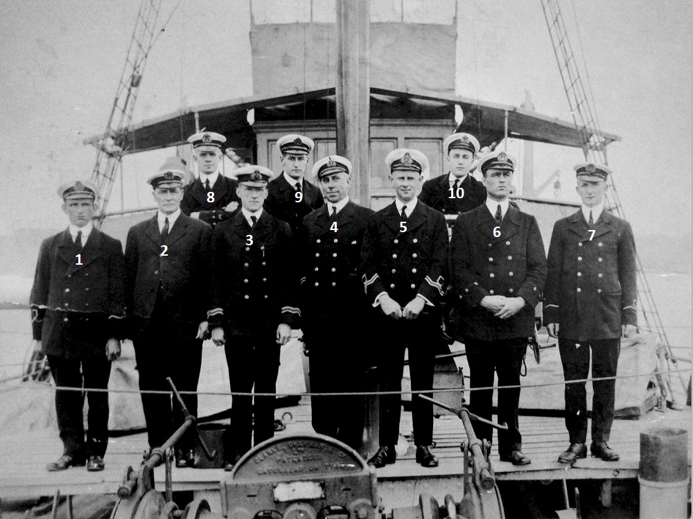 (1) Bourgeois, C.P., Mate (2) (2) Robson, William Alfred, SLt (3) Simpson, Frederick A., Engineer Lieutenant (4) Wood, Herbert H. DeLally, Lt (5) Maude, George, Lt (6) Murphy, Joseph M., Artificer Engineer (7) Chandler, William Ralph, Mate (8) Davidson, John, W/T Op 4c (9) Duncan, Walter Cameron Cruickshank, W/T Op 3c (10) Peters, Allan Gordon W/T Op 4c