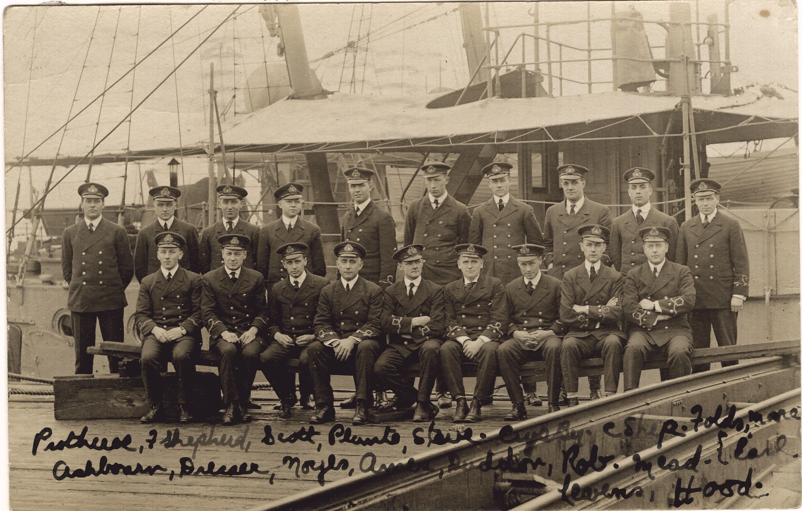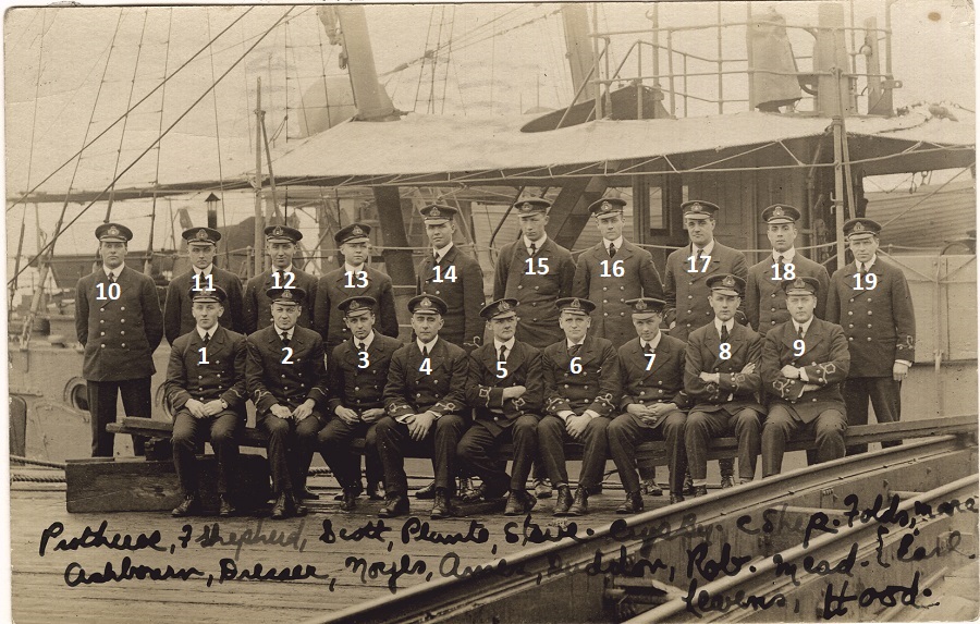 Front: (1) Ashbourne, Elmo Linfield (2) Dresser, James Sherwood (3) Finch-Noyes, Grenville Roy (4) Amies, Benjamin George (5) Haddon, Gerald P. (Act) Staff Paymaster (6) Robinson, Bertram D. (7) Mead, Frank C.C. (8) Leavens, Harry C. (9) Hood, Thomas