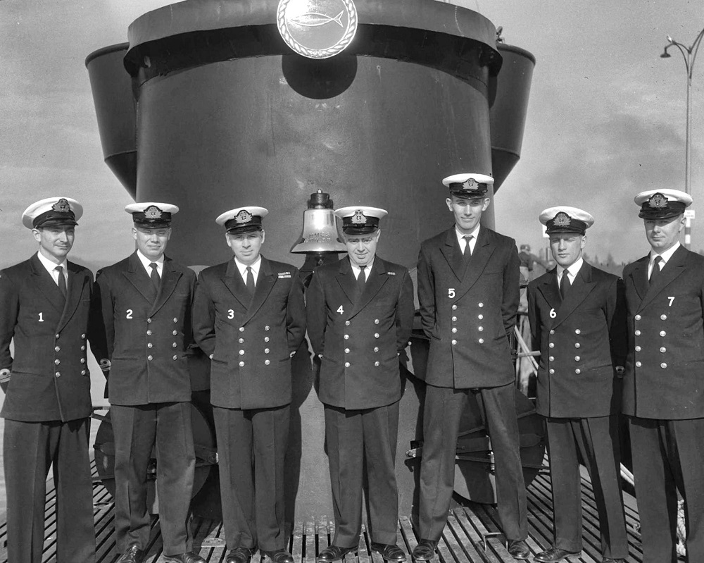 (1) Gillard, Rob, Lt (2) Crow, Cliff, Lt (3) McMorris, George, LCdr, CO (4) McKay, Rusty, LCdr, XO (5) Brown, Donal, Lt (6) Gunning, Charles, Lt (7) Kirk Peter, Lt