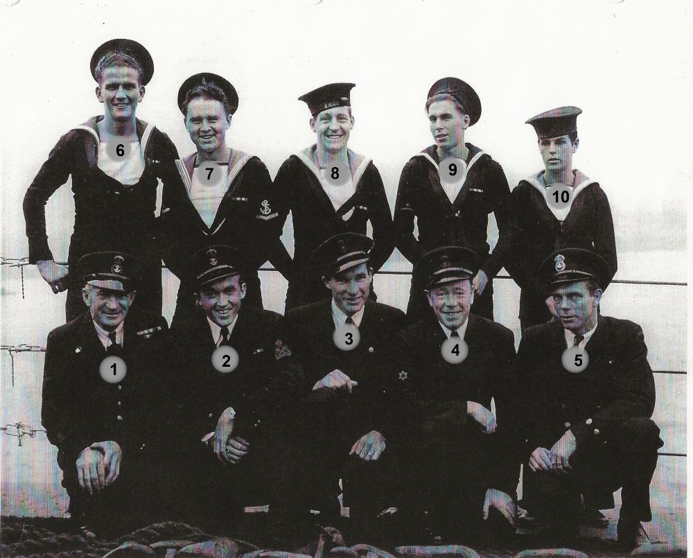 HMCS WASKESIU K330 Click on the above photo to view a larger image without numbers (1) Courtney, A. (2) Leahey, Gerry (3) unknown (4) MacCarther, Scotty (5) Turner, G. (6) Buse, Heith (7) Dawson, R. (8) Rudland, G. (9) Agnew, Irving (10) Hartley, Bill From the collection of Walter Ritchie, RCNVR Courtesy of John H. Rickard, Lt (N), RCN
