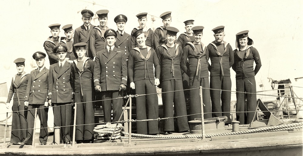 (01) MacCrae, Doug (02) Lamond, David, CPO (03) Martin, Charles Philip, Lt, RCNVR (04) Hantamen, Ed (05) Beeman, John Henault, Lt, RCNVR, Commanding Officer (06) Regan, Albert (07) Hollings, Albert (08) Leblanc, Henry (09) Holliday, Arthur (10) McLean, Douglas Harold, Leading Seaman (11) Kranch, Norman (12) Dick, Benson (13) Johnson, Percy (14) Watson, Jack (15) Granger, Babe, Petty Officer (16) O'Brien, Donald (17) Cluff, Ken (18) Johnston, Harvey