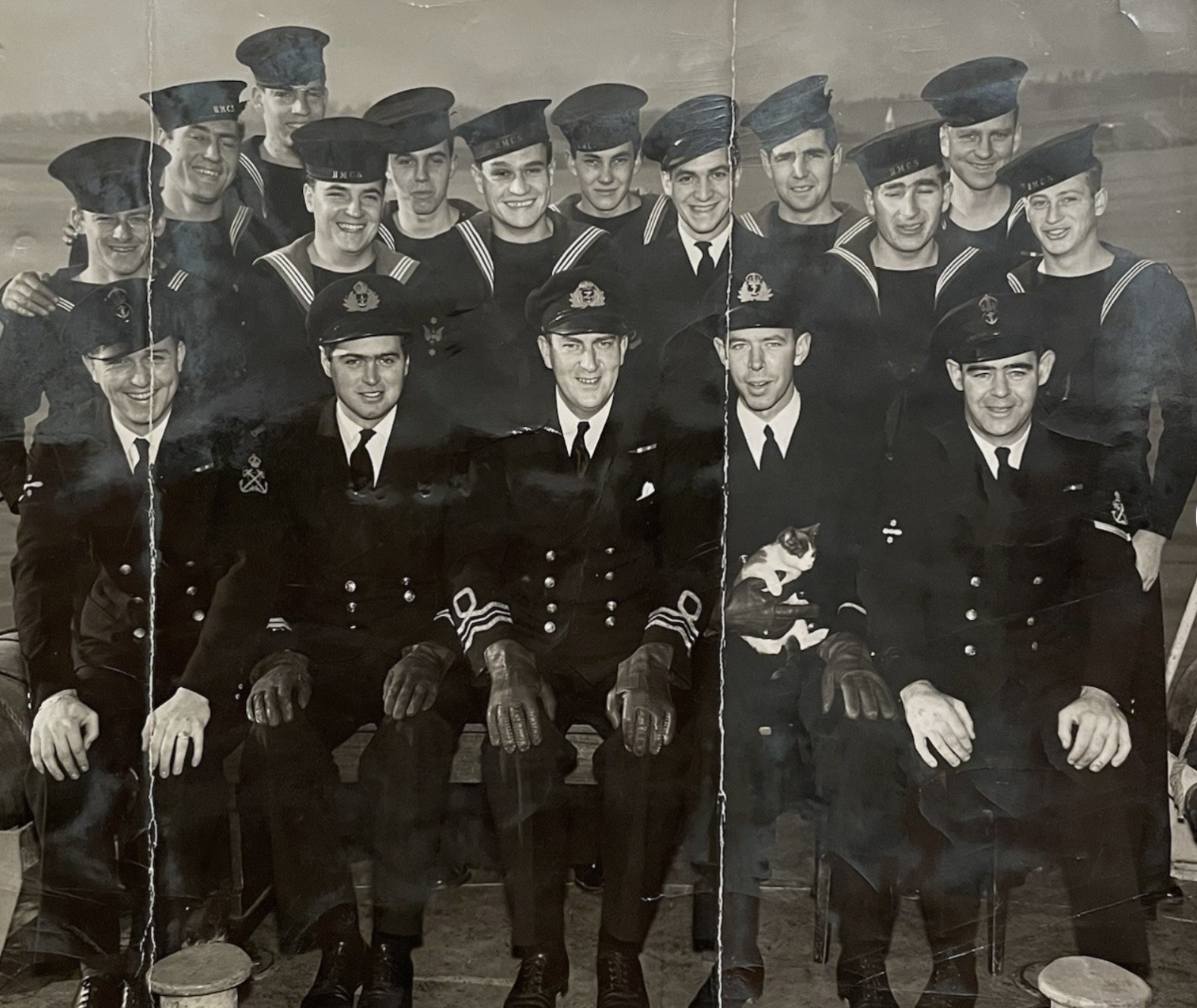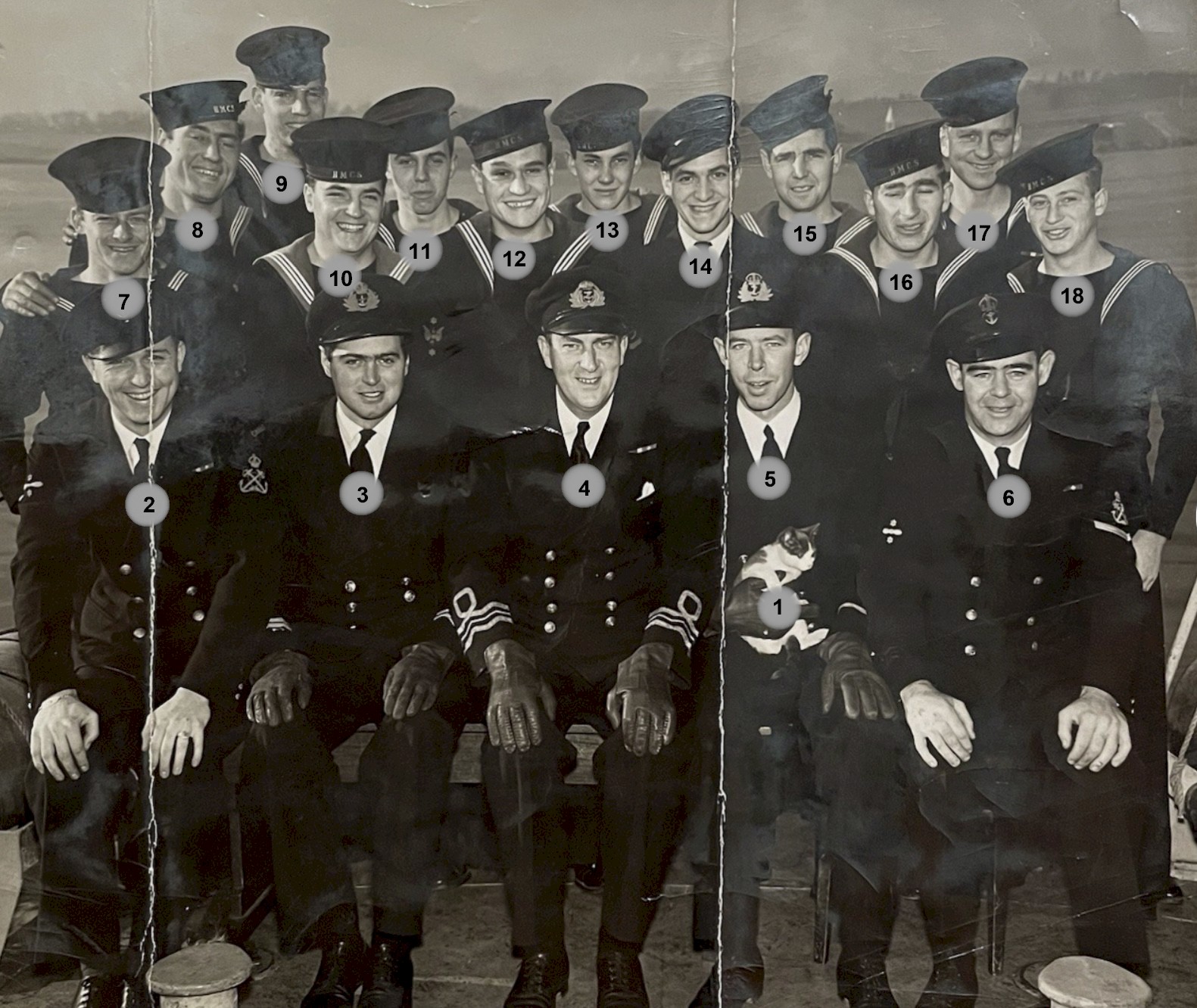 This photo was found in an antique store in Medicine Hat, Alberta. The CO of the vessel is a LCdr. While a number for Fairmiles had a LCdr as a CO, only Q051 had one as a CO in Jan 1945. That being the case, it is likely this is Q051 and the CO is (4) LCdr Walter H. B. Thomson, RCNVR which would make the SLt to his right (5) Walter Angus Jay, RCNVR