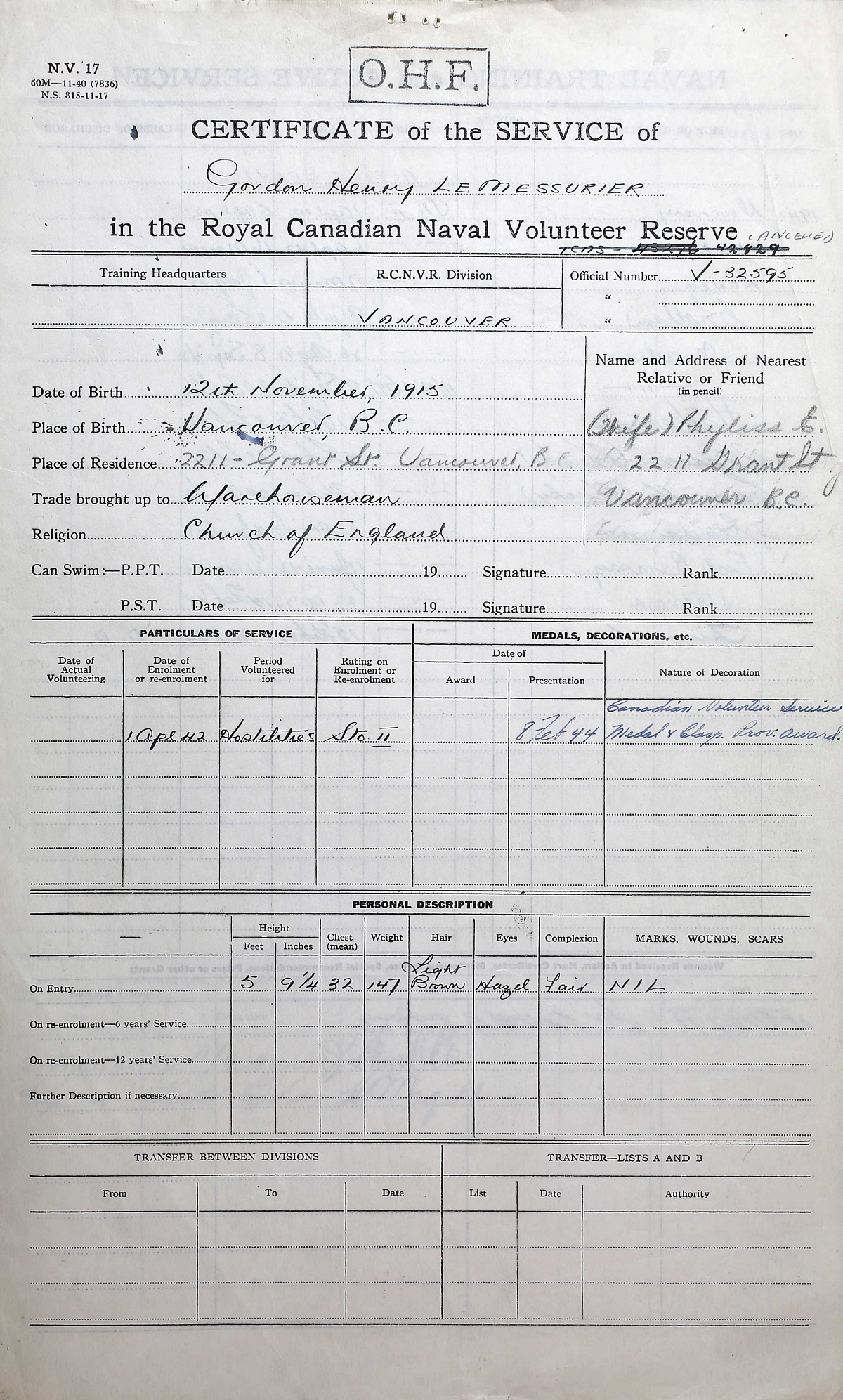 (1) Certificate of Service (2) Naval Training and Active service record for PO Gordon LeMessurier