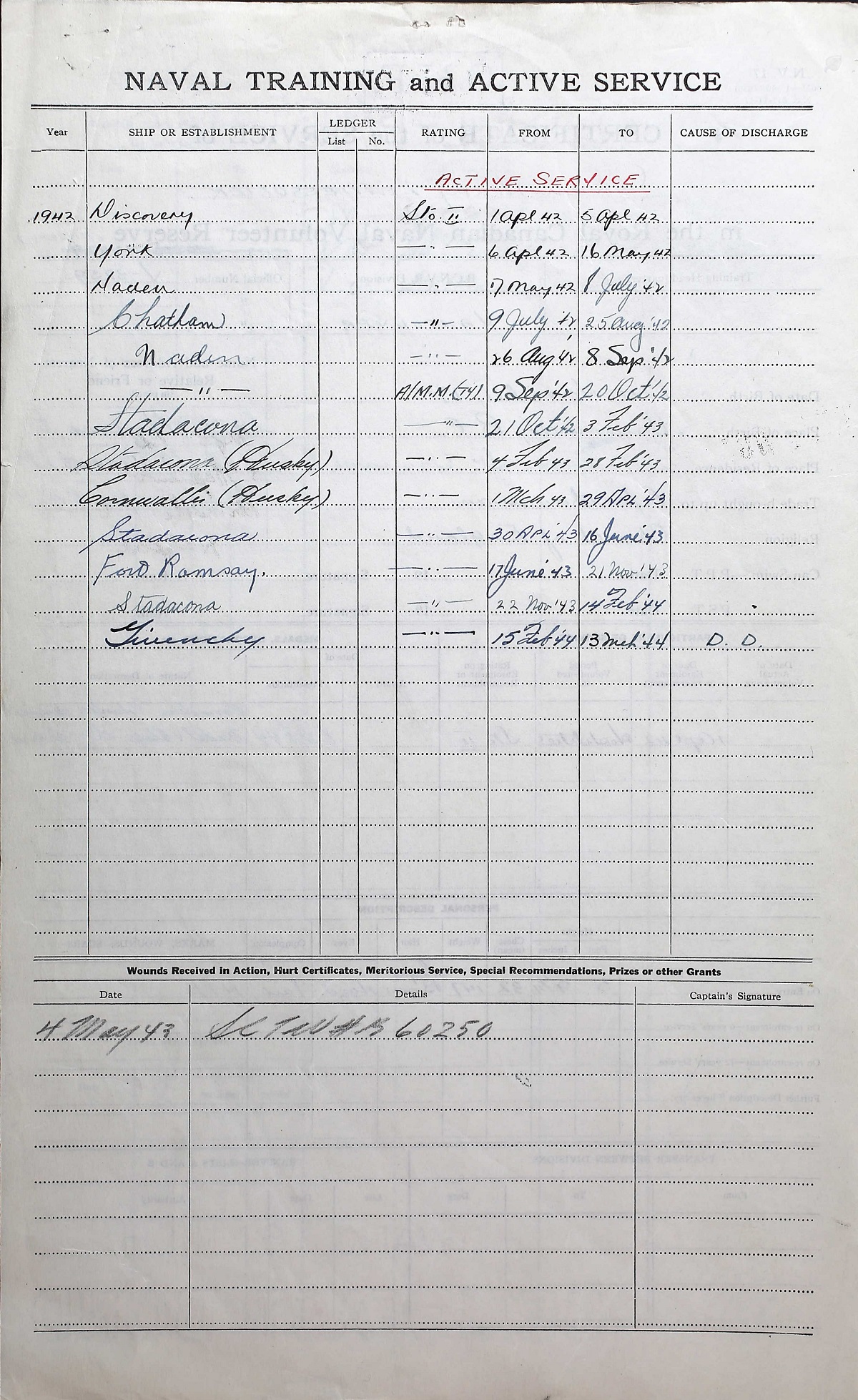 Ships served in: HMCS HUSKY - Served in Husky 04 Feb 1943 - 29 Apr 1943