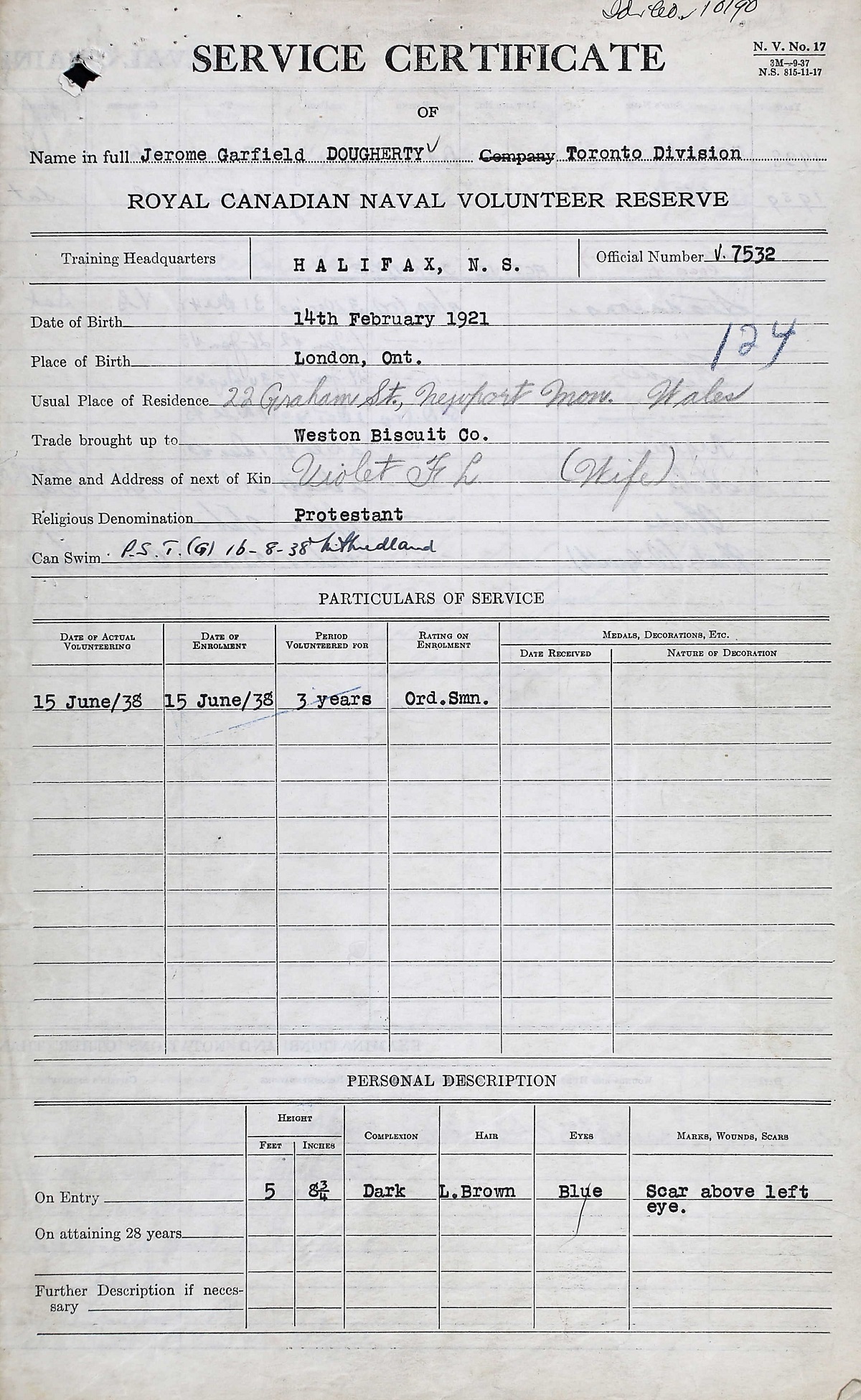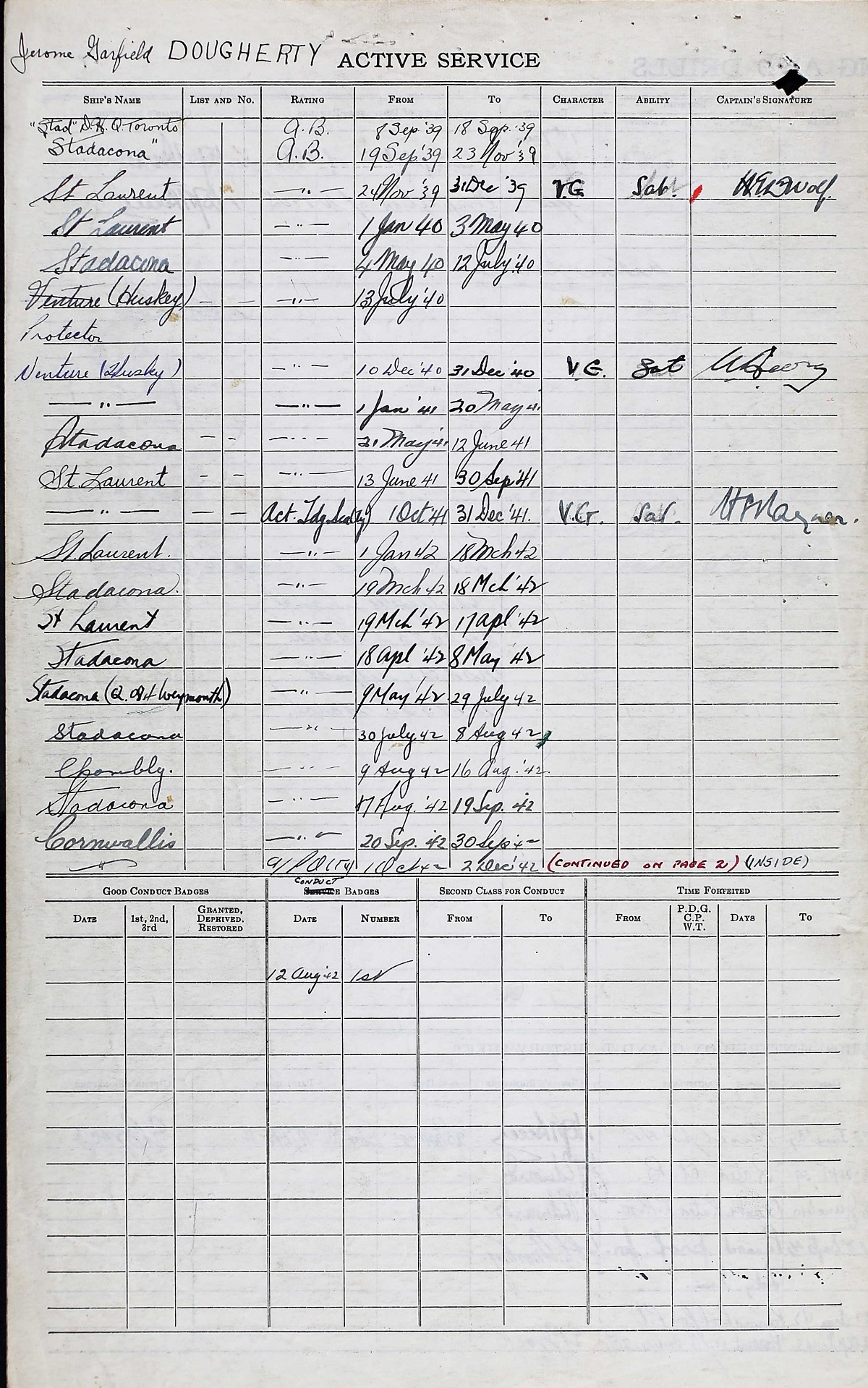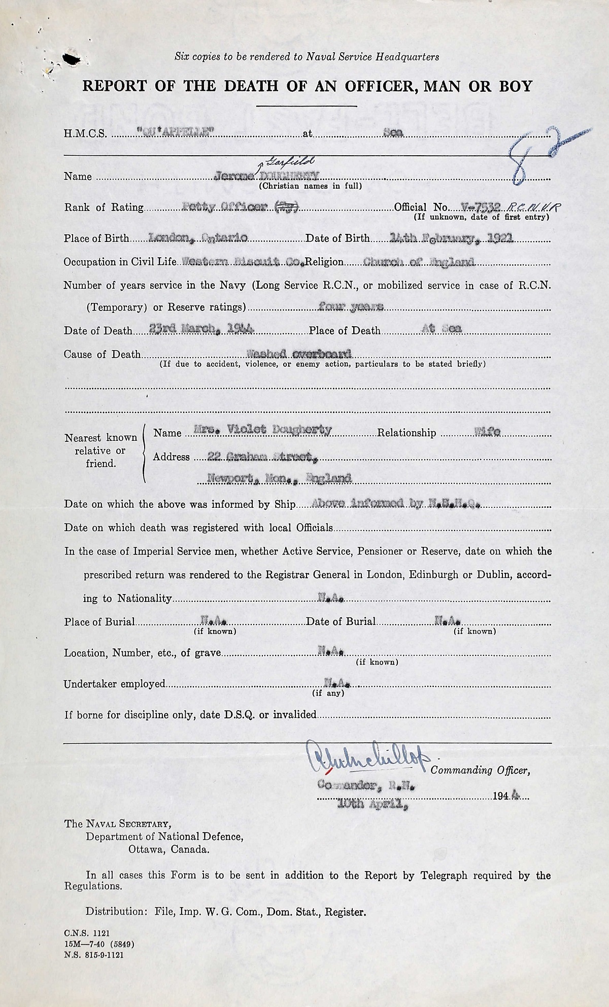 DOUGHERTY, Jerome Garfield PO, V7532, RCNVR MPK - 23 Mar 1944, HMCS QU'APPELLE - Son of Lavinia Dougherty, Toronto, ON; husband of Violet Florence Dougherty, Newport, Monmouthshire, Wales.