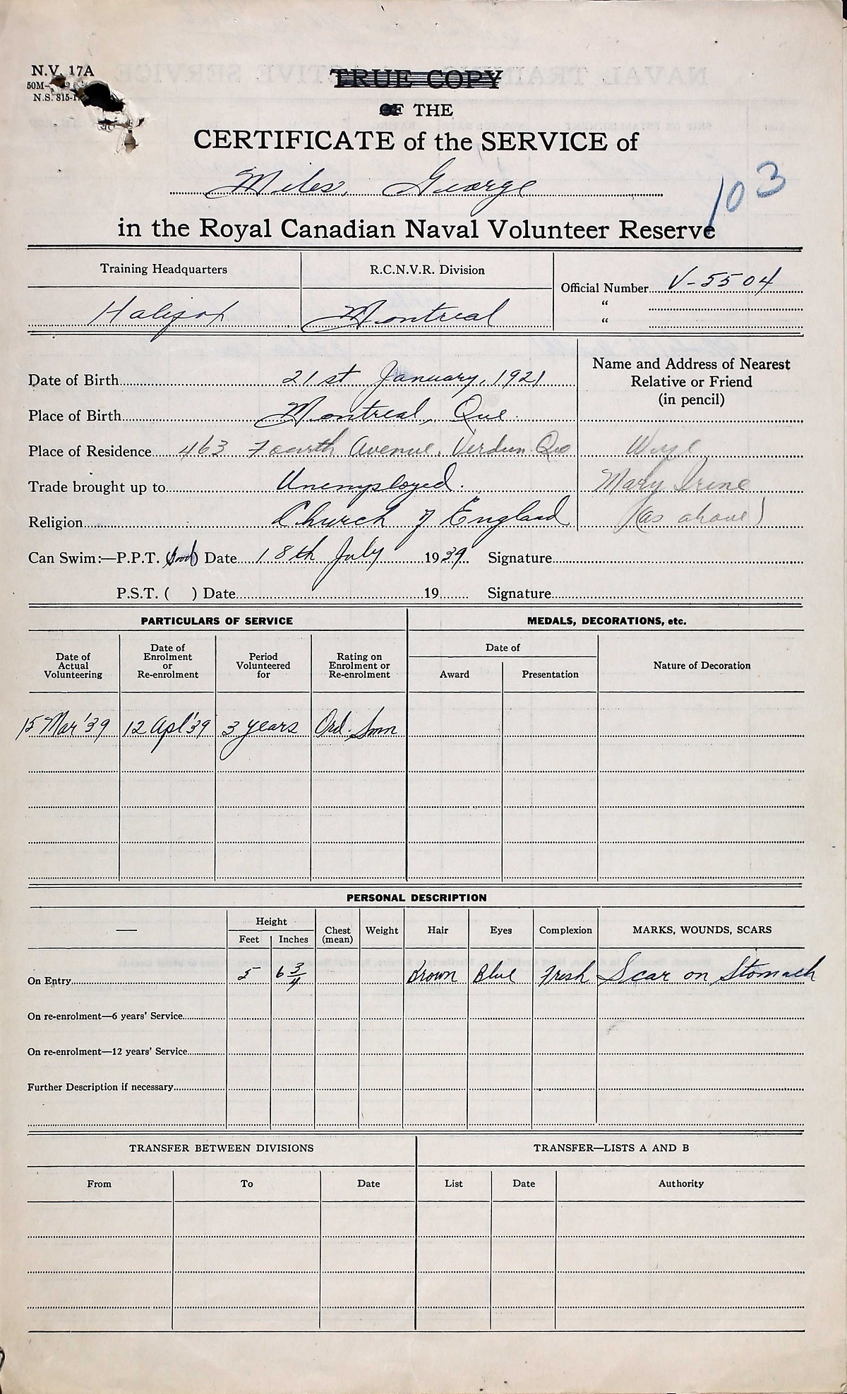 Ships served in: HMCS OTTAWA - Served in OTTAWA 08 Apr 1940 - 03 May 1940 as an OS, RCNVR HMCS LYNX - Served in LYNX 21 Oct 1940 - 13 Nov 1940 as an AB, RCNVR ISLANDER (Harbour Craft) - Served in ISLANDER 24 May 1941 - 10 Jan 1942 as an AB, RCNVR HMCS LA MALBAIE - Served in LA MALBAIE 29 Apr 1942 - 22 Jul 1942 as an AB, RCNVR HMCS ATHABASKAN - Served in ATHABASKAN 04 Feb 1943 - 08 Oct 1943 as an AB, RCNVR HMCS RESTIGOUCHE - Served in RESTIGOUCHE 10 Nov 1943 - 23 Dec 1943 as an AB, RCNVR HMCS QU'APPELLE - Drafted to QU'APPELLE 08 Feb 1944