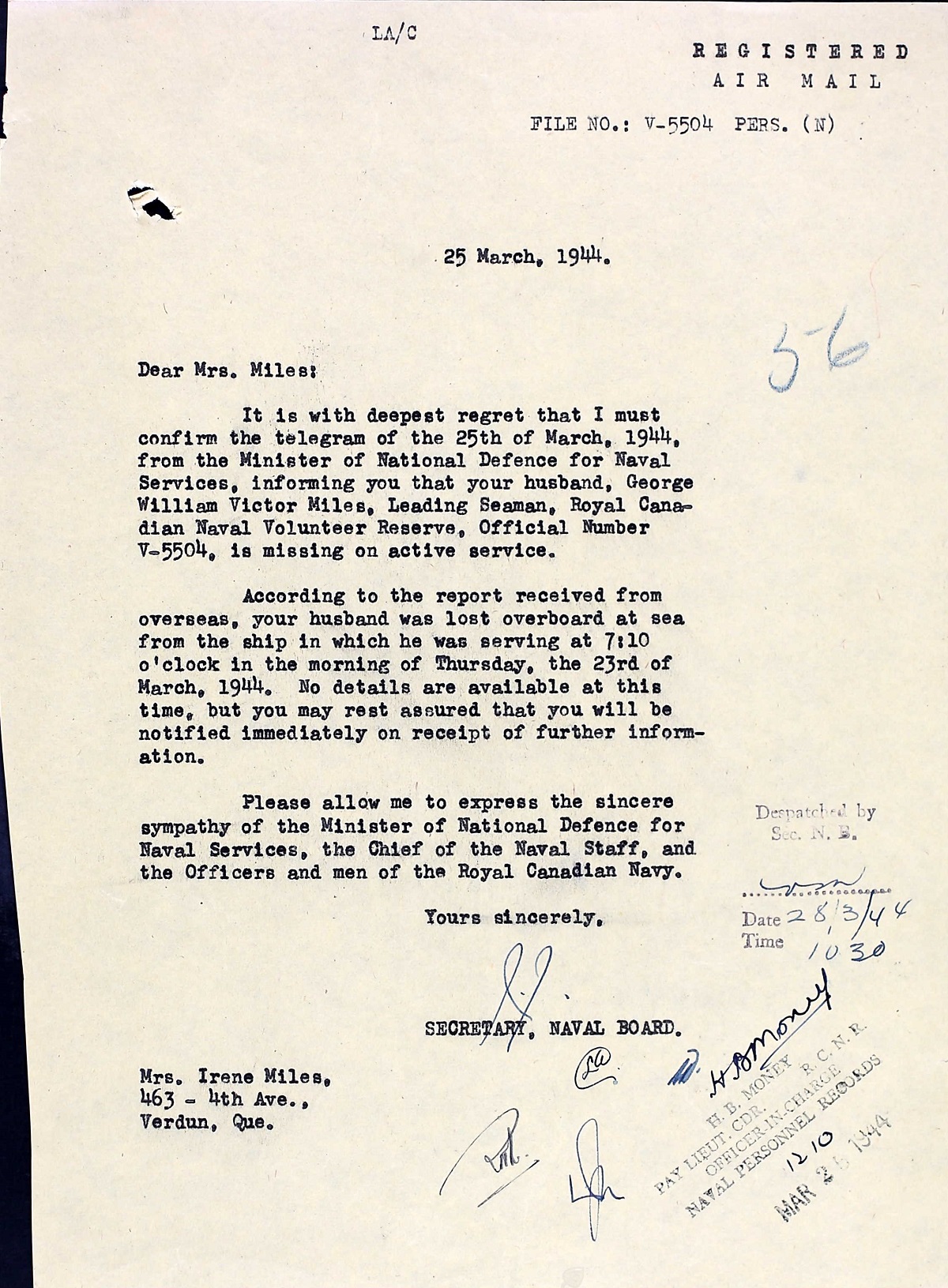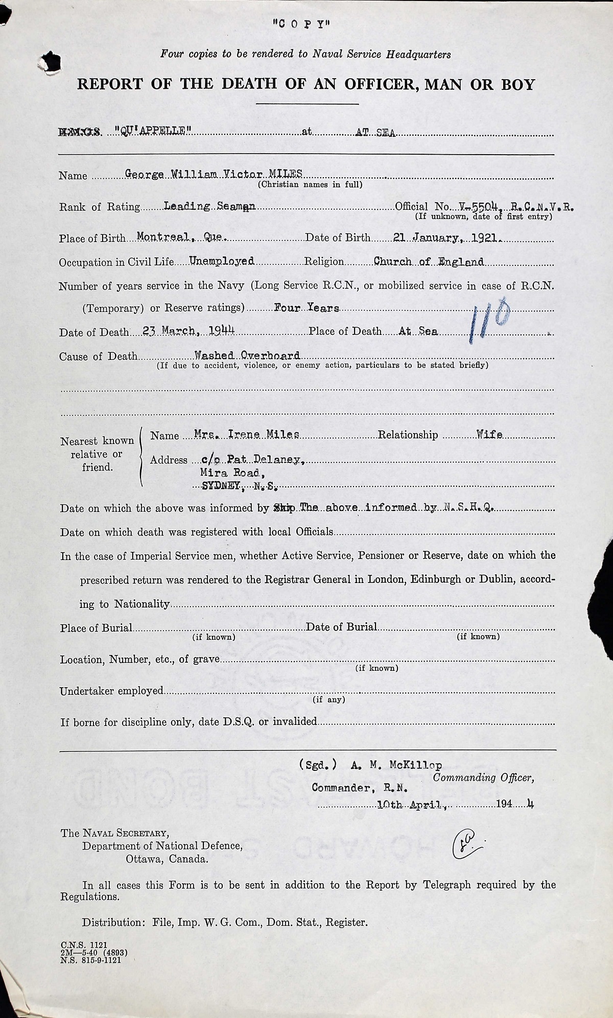 MILES, George William Victor, LS, V5504, RCNVR, MPK - 23 Mar 1944, HMCS QU'APPELLE - Son of Victor G. and of Nora Miles, Verdun, QC; husband of Mary Irene Miles, Sydney, NS.