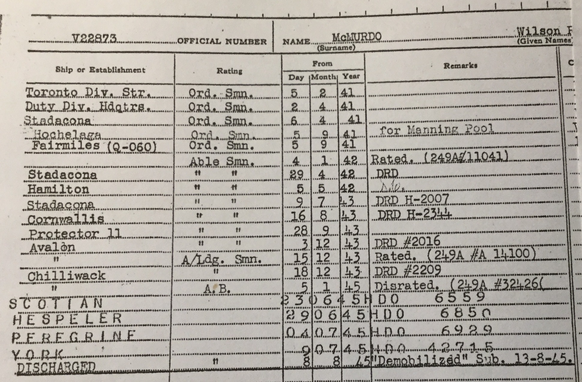 Ships served in: ML Q060 - Served in Q060 05 Sep 1941 - 28 Apr 1942 as an OS, RCNVR. Commissioning crew HMCS HAMILTON - Served in Hamilton 05 May 1942 - 08 Jul 1943 HMCS CHILLIWACK - Served in Chilliwack 18 Dec 1943 - 04 Jan 1945 as an AB, RCNVR HMCS HESPELER - Served in Hespeler 29 Jun 1945 - 03 Jul 1945