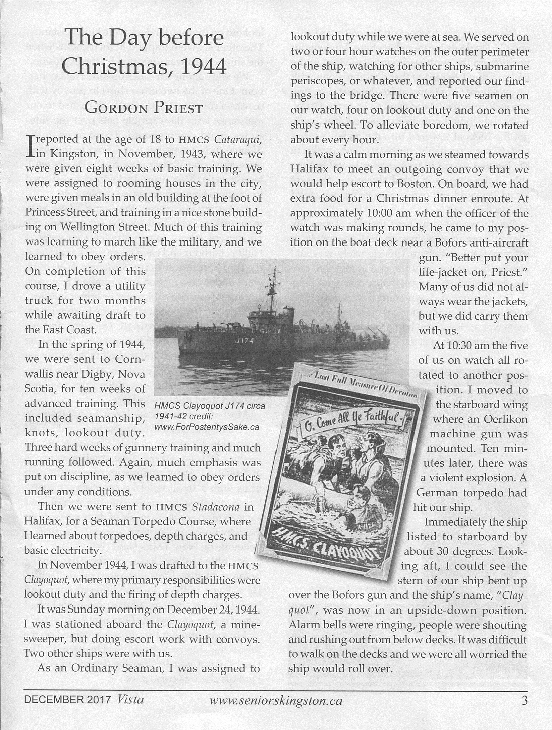 The Day before Christmas, 1944 - Surviving the sinking of HMCS Clayoquot Source: Vista - Seniors Association Kingston Region Newsletter - Dec 2017 Courtesy of Nicki Long