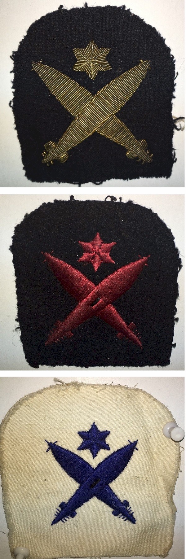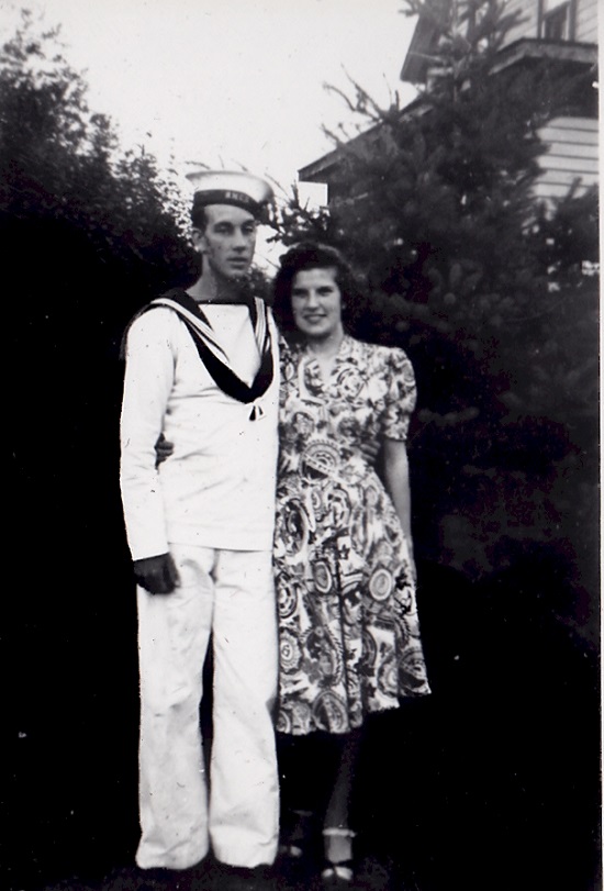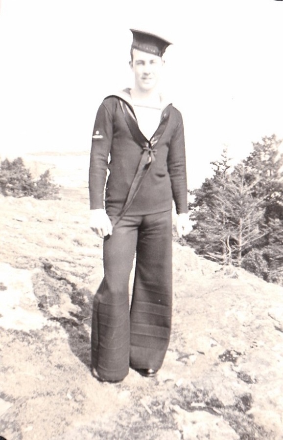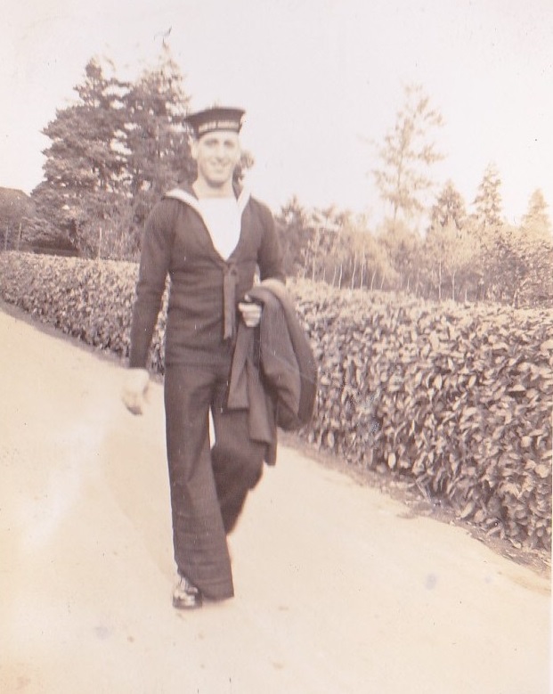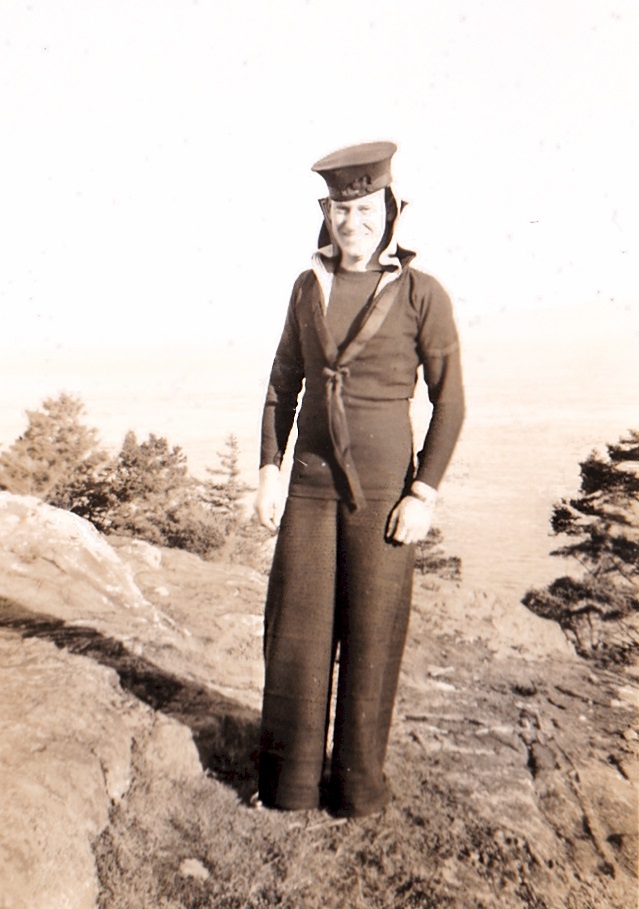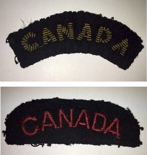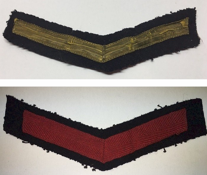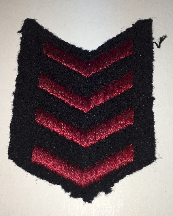(1) Seaman George Huntbatch  (2) George's Good Conduct badge (top - #1 uniform, bottom #2 uniform)  (3) George's Canada flashes  (4) George's Seaman Torpedoman trade badge for #2 uniform  (5) George's Leading Torpedoman trade badge for #1, #2 and Work Dress uniforms  (6)  1 chevron for each year of overseas service. Initially worn on the lower left sleeve, it was moved to the lower right sleeve in 1944.  (7) Christmas card that George sent home to his parents