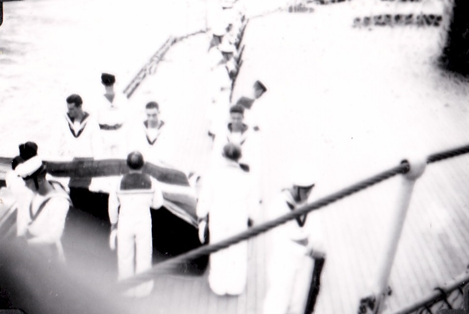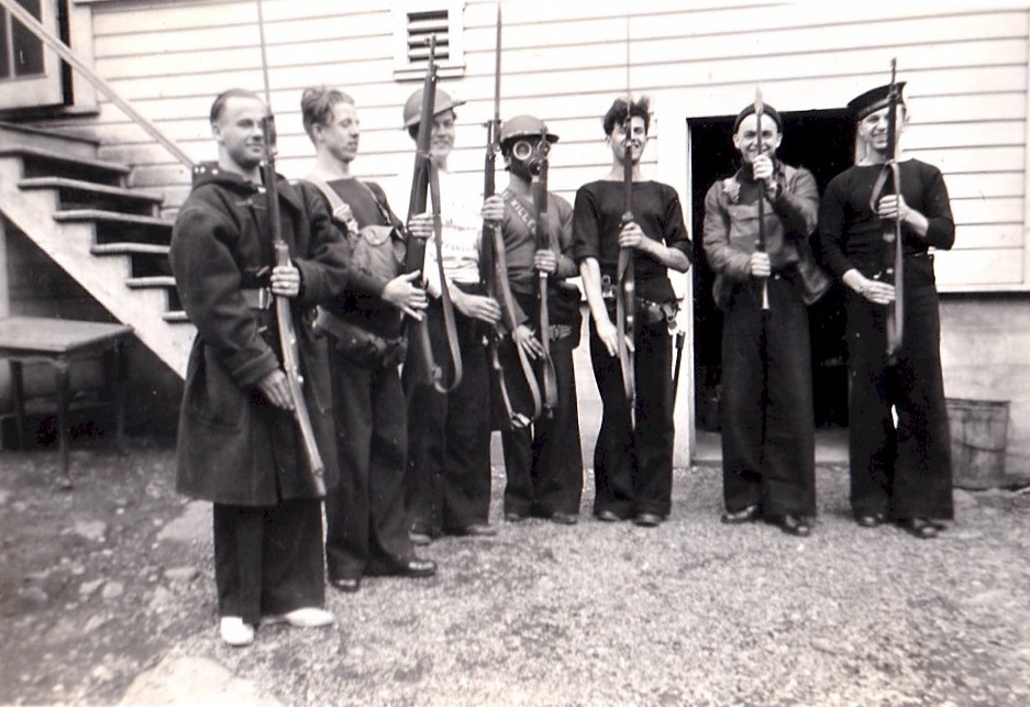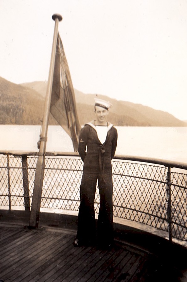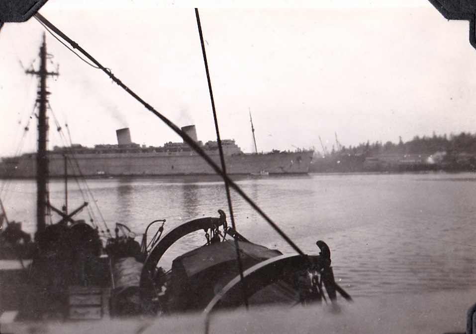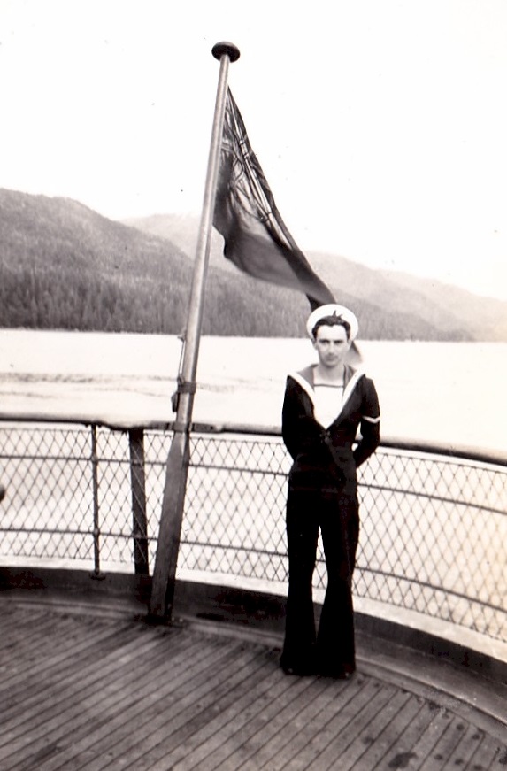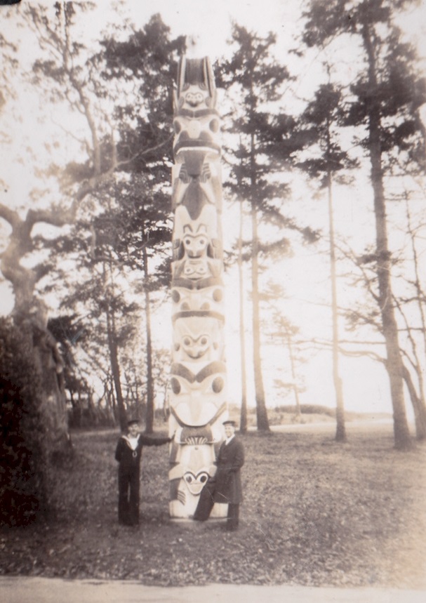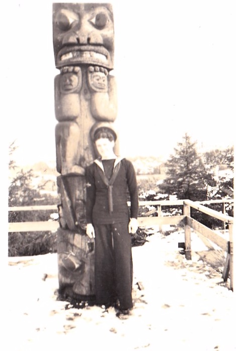 (56 & 57) RMS Queen Elizabeth arrives at Esquimalt  (58) Burial at sea - unknown sailor / unknown ship  (59) unknown ship in drydock in Esquimalt  (60) HMCS Prince David  (61) Sailors on unknown ship. Note that the sailor on the right is wearing a HMCS Givenchy sweatshirt  (62) First Nations graveyard somewhere in BC  (63) unknown sailor by totem pole somewhere in BC
