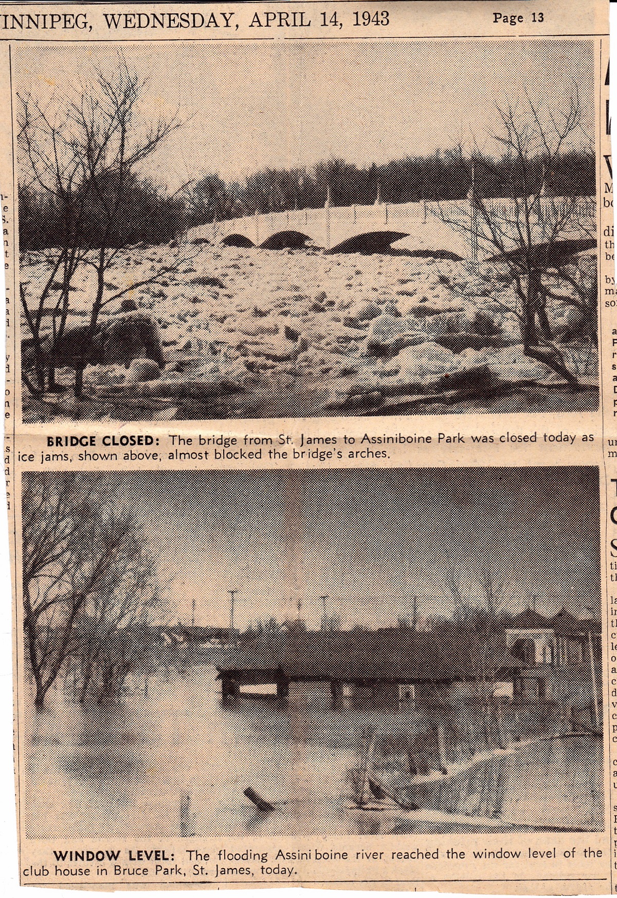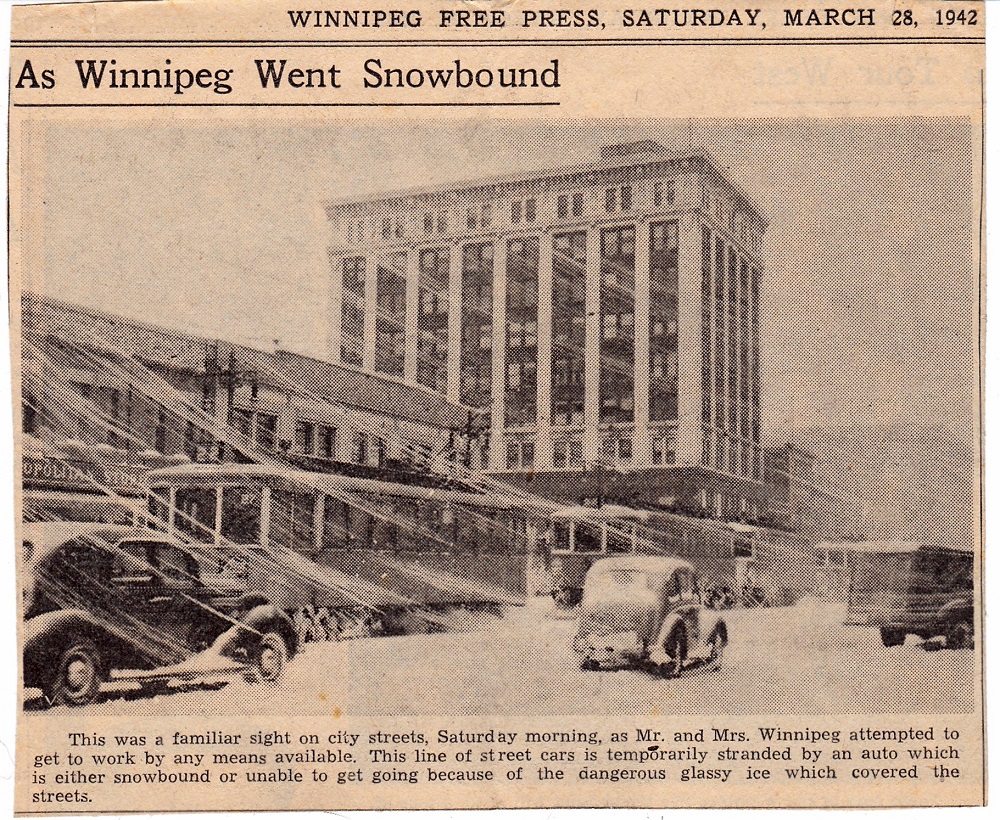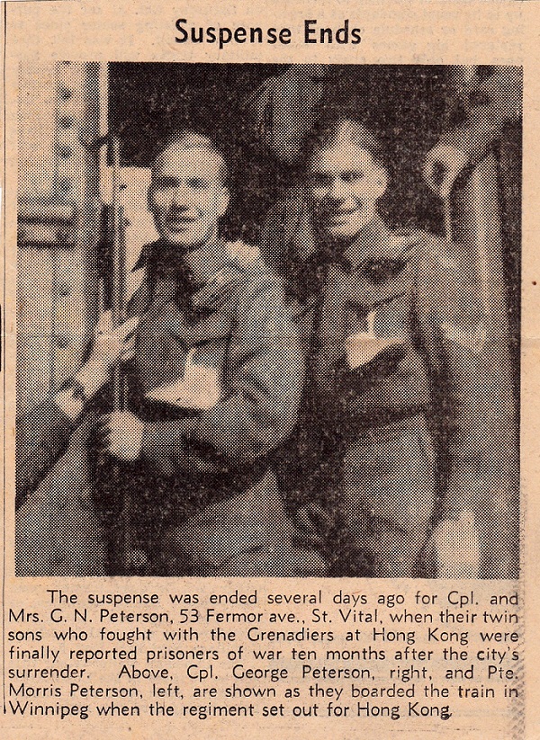 (1) Article on Cpl George Peterson and Pte Morris Peterson, Winnipeg Grenadiers, captured after the fall of Hong Kong  (2) Article on recruits training in Brandon, MB  (3) Article on Cpl Joe Dubois, RCAF from Winnipeg. Also in article Frank Dunlop, Jack Morrice and Albert Schmok  (4) Article on a snowstorm that hit Winnipeg, March 1942  (5) Article on the flooding of the Assiniboine River, Apr 1943  (6) Article on Seaman Bert Faulley of Winnipeg returning to duty after 5 days furlough  (7) Article on two former Winnipeg Excelsiors hockey players now in the Navy watching local game - Wilf Clarke and Ab Warren
