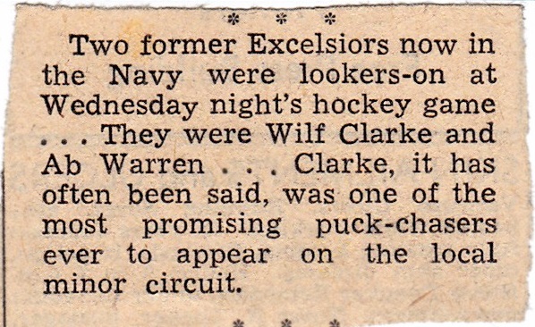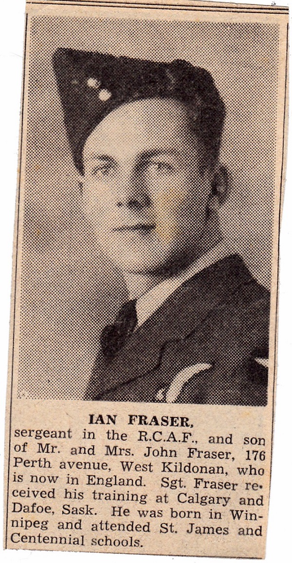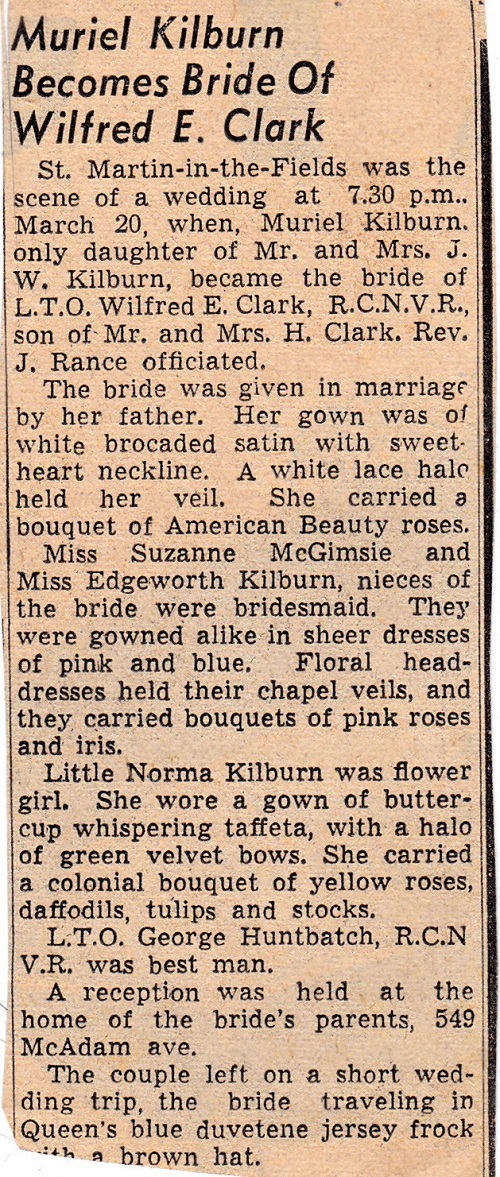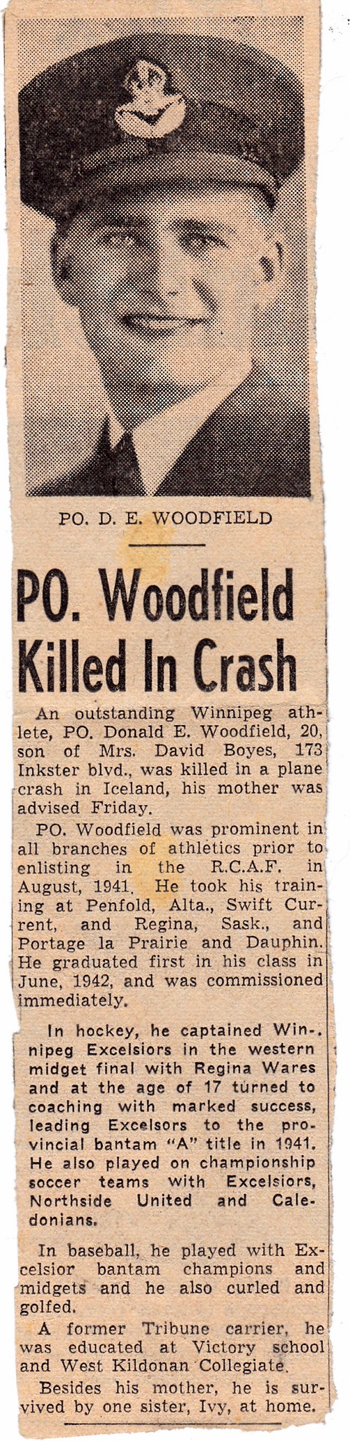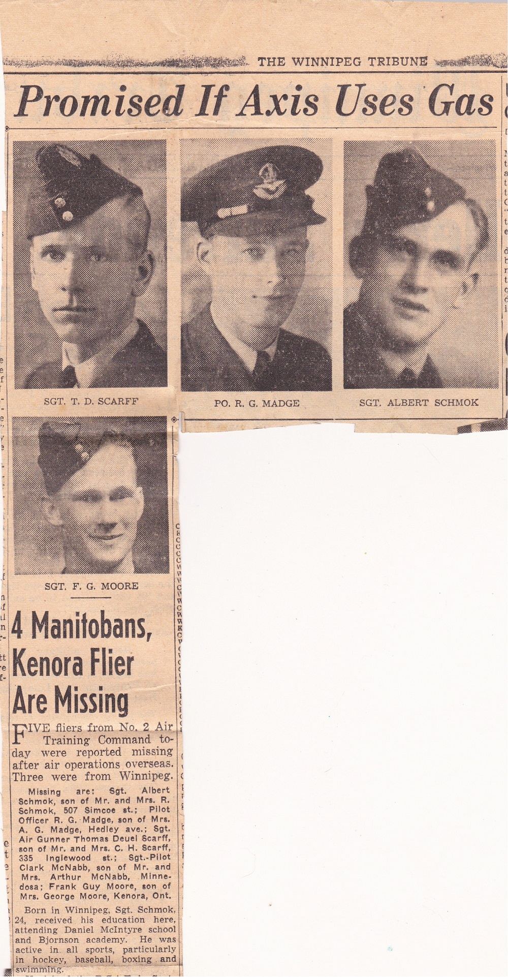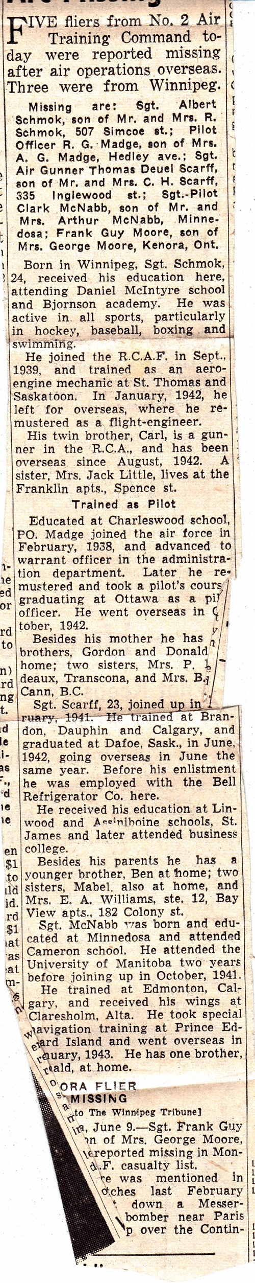 (8) Article on Sgt J.H. "Bud" Dunn, R.A.F., missing presumed killed  (9) Article on PO Donald E. Woodfield, RCAF, former Winnipeg Excelsiors Captain, killed in a plane crash  (10) Article on Sgt Ian Fraser, RCAF, now on duty in England  (11) Article on commissioning of L.P. Beech to Lieutenant (nephew of Commodore William J.R. Beech, RCN)  (12) Article on wedding of Muriel Kilburn to L.T.O. Wilfred E. Clark, RCNVR. L.T.O. George Huntbatch was best man  (13 & 14) Article on 5 missing airmen:  Sgt Albert Schmok, Pilot Officer R.G. Madge, Sgt Air Gunner Thomas Deuel Scarff, Sgt Pilot Clark McNabb, all of Manitoba and Frank Guy Moore of Kenora, Ont.