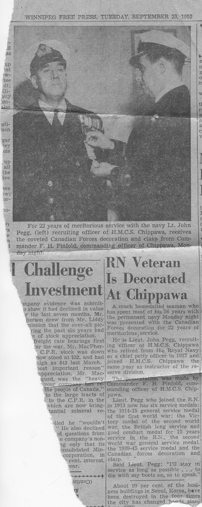 Lt John Pegg received the Canadian Forces Decoration with Clasp Winnipeg Free Press 23 Sep 1952