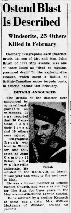 Ordinary Telegraphist J. C. Brush was killed in an accidental explosion on a motor torpedo boat in Belgium; his body was recovered and buried on shore at Oostende New Communal Cemetery which is located in the town of Oostende.