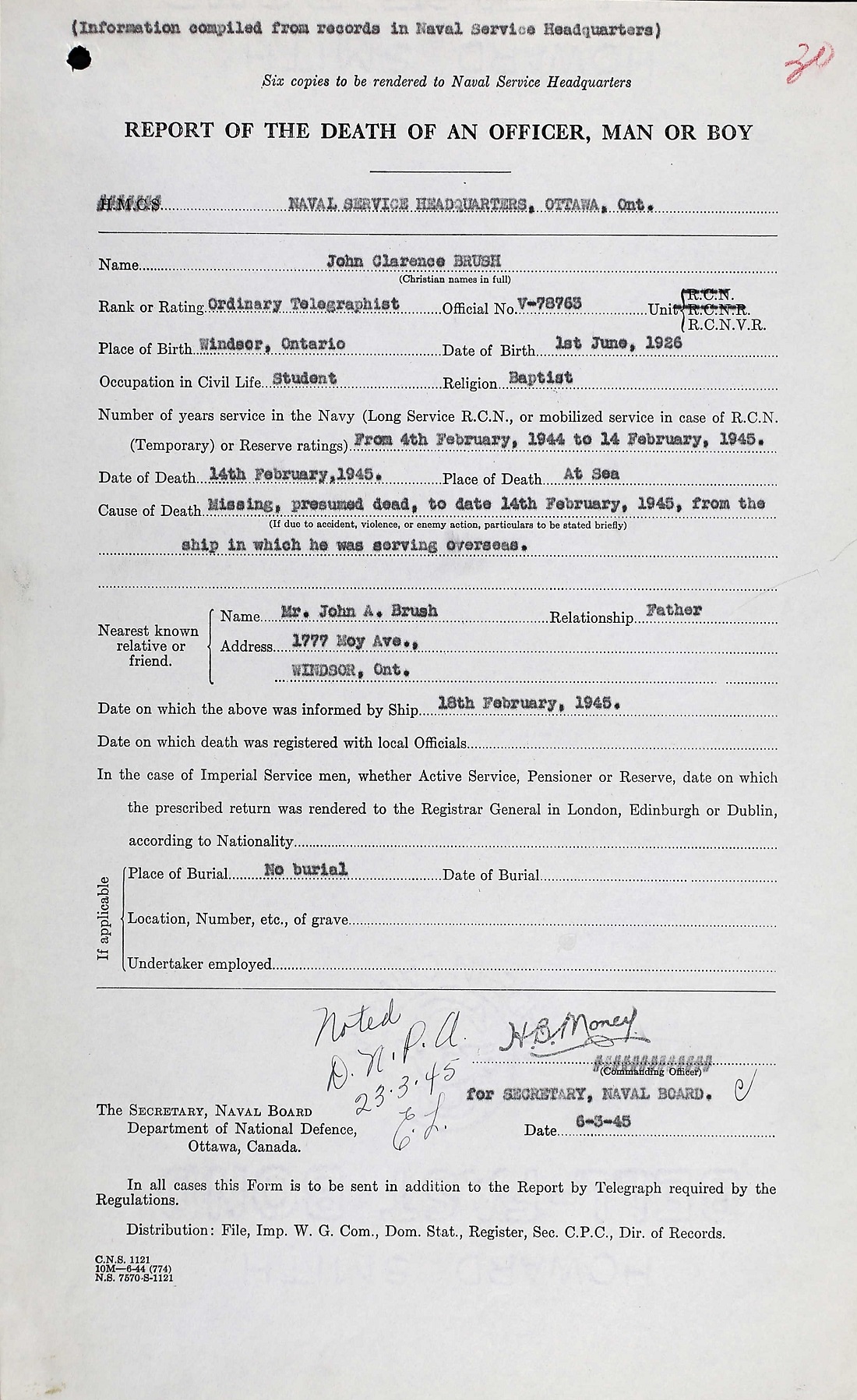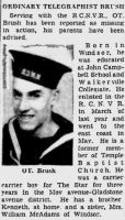 BRUSH, John Clarence, O/Tel, V78763, RCNVR, killed - 14 Feb 1945, MTB 465 - son of John A. L. and Ethel Brush, Windsor, ON.