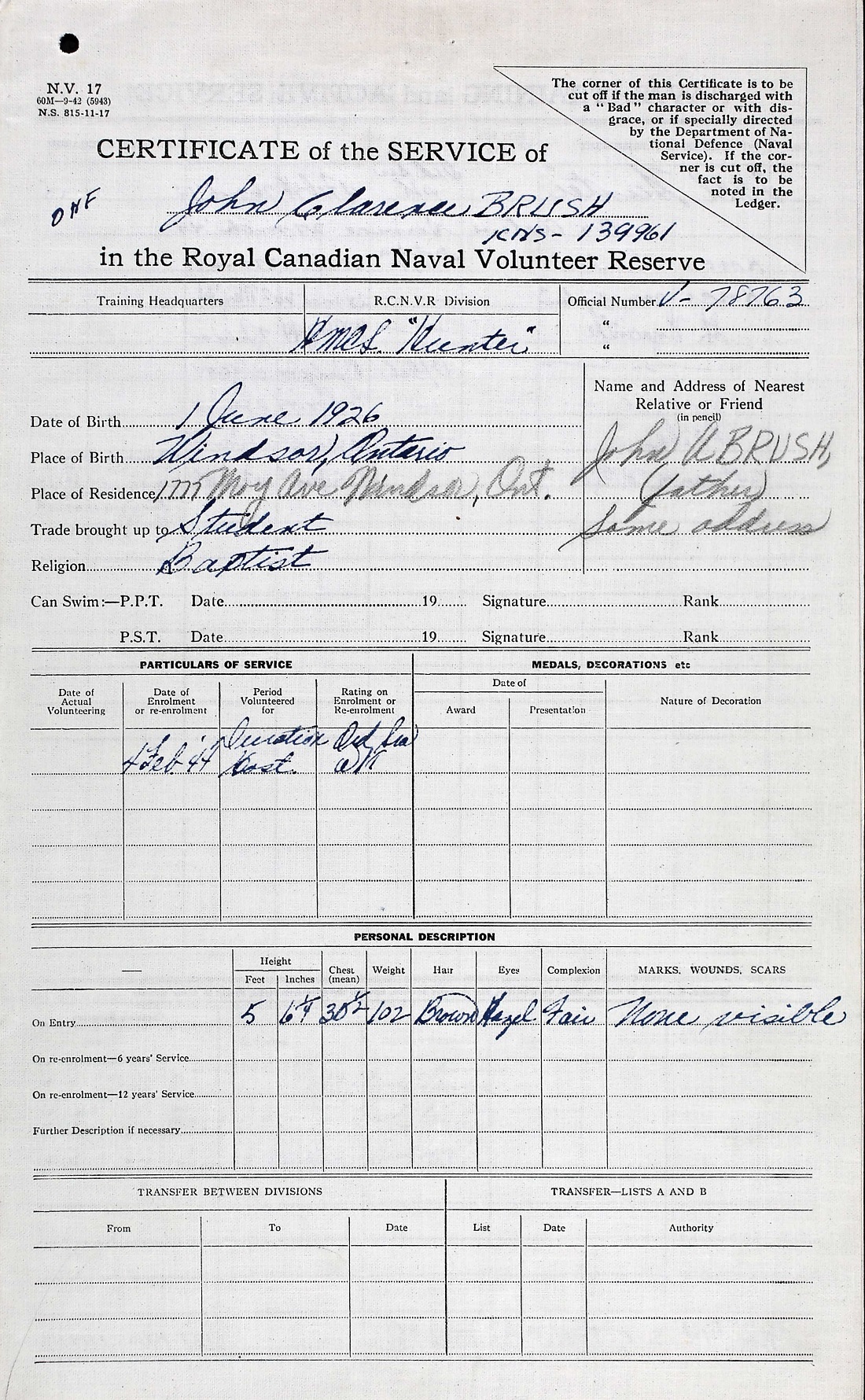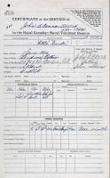 Ships served in: HMCS HUNTER - Enlisted 04 Feb 1944 * Commenced Active Service 27 Mar 1944 HMCS MONTCALM - Drafted to MONTCALM 28 Mar 1944 HMCS ST HYACINTHE - Drafted to ST HYACINTHE 03 May 1944 * Rated Ordinary Telegraphist, RCNVR 08 Jul 1944 HMCS PEREGRINE - Drafted to PEREGRINE 05 Dec 1944 HMCS NIOBE - Drafted to NIOBE 03 Jan 1945 29TH MTB FLOTILLA - Drafted to the 29TH MTB FLOTILLA 15 Jan 1945