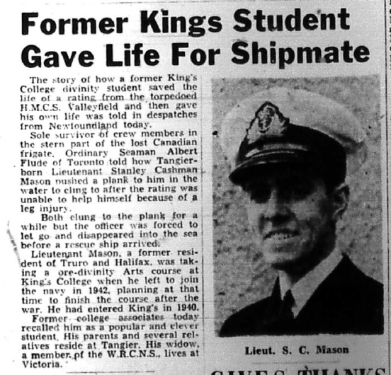 MASON, Stirling Cashman, Lt, O-47000, RCNVR, MPK - 07 May 1944, HMCS VALLEYFIELD - Son of James Edgar and Myrtle Victoria Mason (nee Beaver), of Tangier, Nova Scotia. Husband to Julia Louise Mason (nee Dickinson, later remarried Robert Walter Hampton) and father of Cashman Roger Stirling Mason.