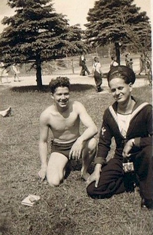 (JB16) Stan Matestead and John Boothman (JB17) Refit Base (JB18-JB19) HMCS FRONTENAC on the slips. FRONTENAC was in refit at Liverpool, NS from Jan to Mar 1945 (JB20) Troopship seen from HMCS FRONTENAC