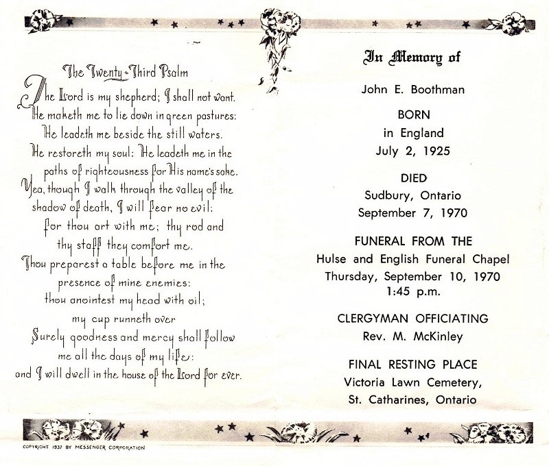 BOOTHMAN, John E. - In Memory of John E. Boothman - Born in England July 2, 1925, Died Sudbury, Ontario, September 7, 1970. Funeral from the Hulse and English Funeral Chapel, Thursday, September 10, 1970. Rev. M. McKinley Officiating. Final resting place, Victoria lawn Cemetery, St. Catharines, Ont.