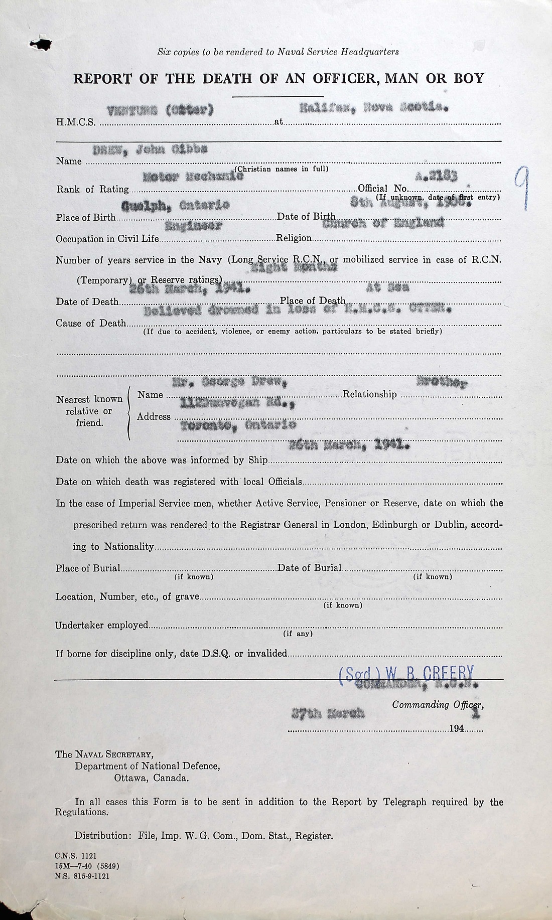 MM Drew was missing, presumed dead after an explosion and fire which resulted in the sinking of HMCS Otter. His body was never recovered.