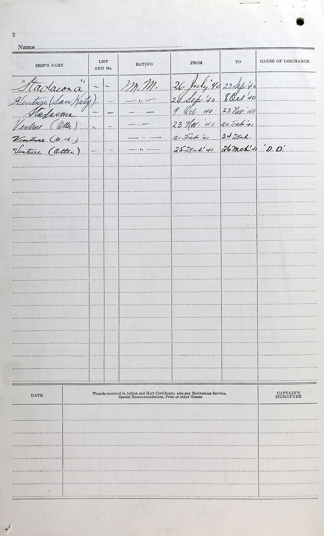 Ships served in: HMCS STADACONA - Drafted to STADACONA 26 Jul 1940 as a MM, RCNVR HMCS SANKATY - Served in SANKATY 24 Sep 1940 - 08 Oct 1940 as a MM, RCNR HMCS STADACONA - Drafted to STADACONA 09 Oct 1940 as a MM, RCNVR HMCS OTTER - Served in Otter 23 Nov 1940 - 20 Feb 1941 HDPC D16 - Served in D16 - 21 Feb 1941 - 24 Feb 1941 as a MM, RCNR HMCS OTTER - Drafted to OTTER 25 Feb 1941 as a MM, RCNVR