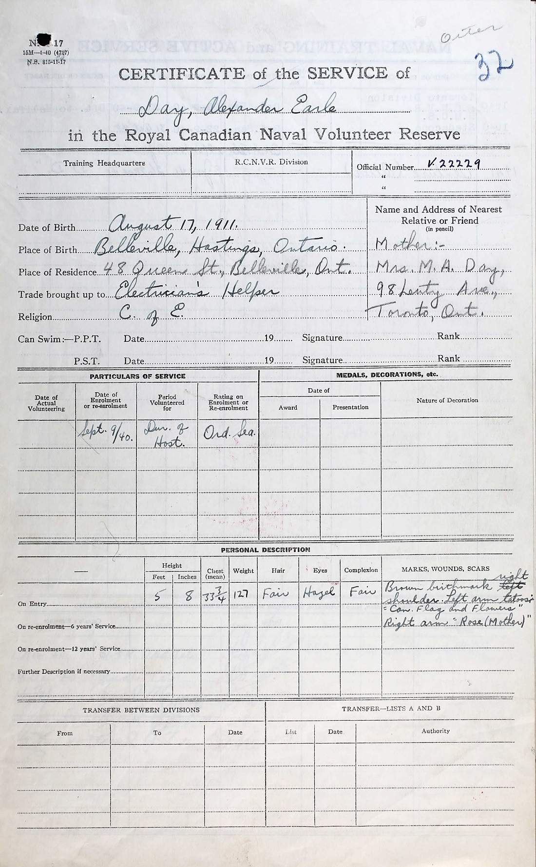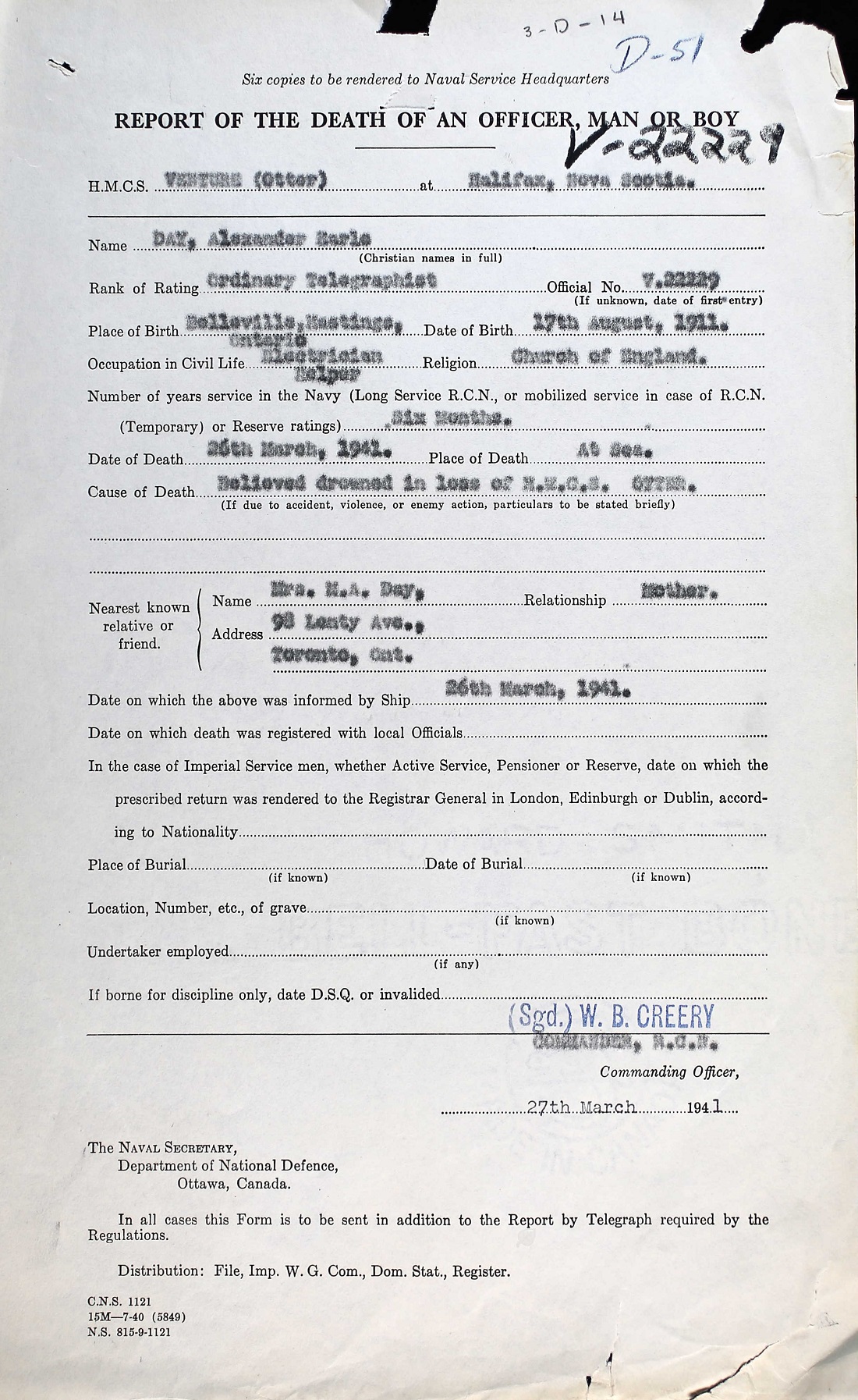 DAY, Alexander Earle, Ordinary Telegraphist, V22229, RCNVR, MPK - 26 Mar 1941, HMCS OTTER - son of Morley A. and Alice Jane Day, of Toronto, ON.
