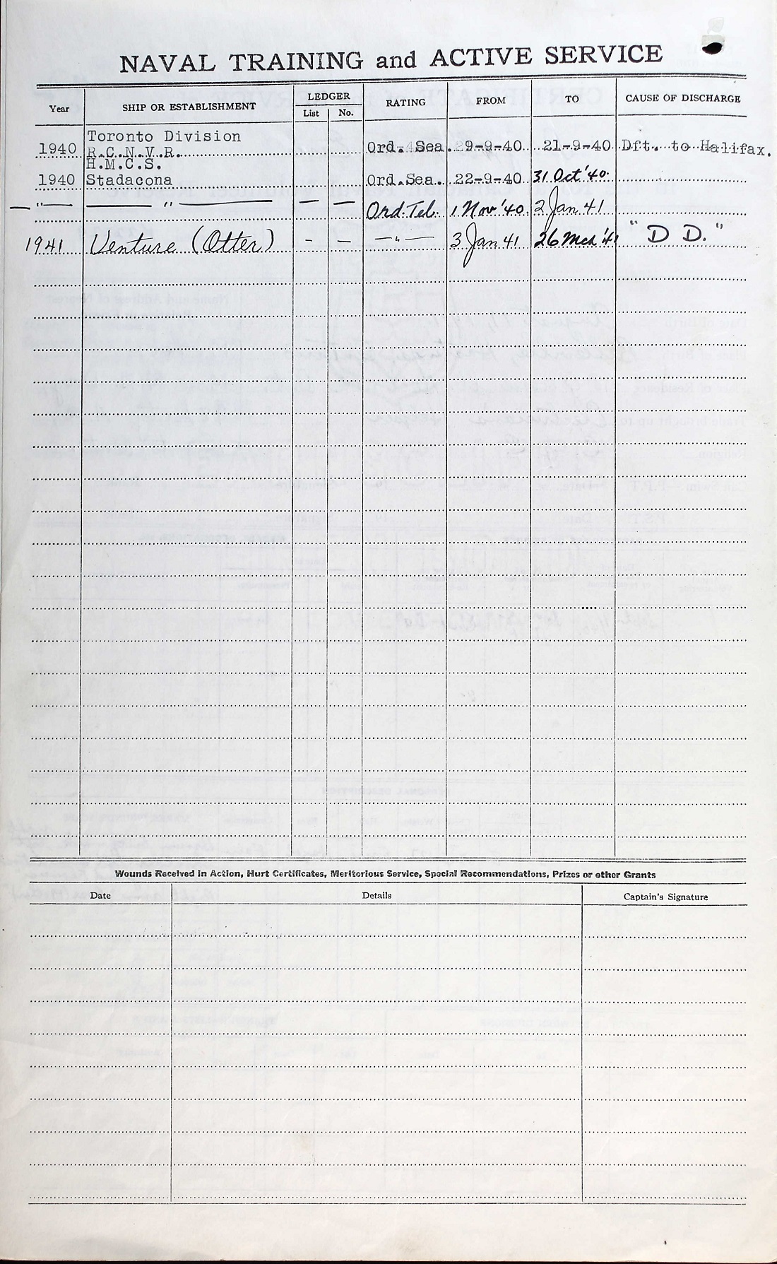 Ships served in: HMCS OTTER - Drafted to OTTER 03 Jan 1941 as an O/Tel, RCNVR