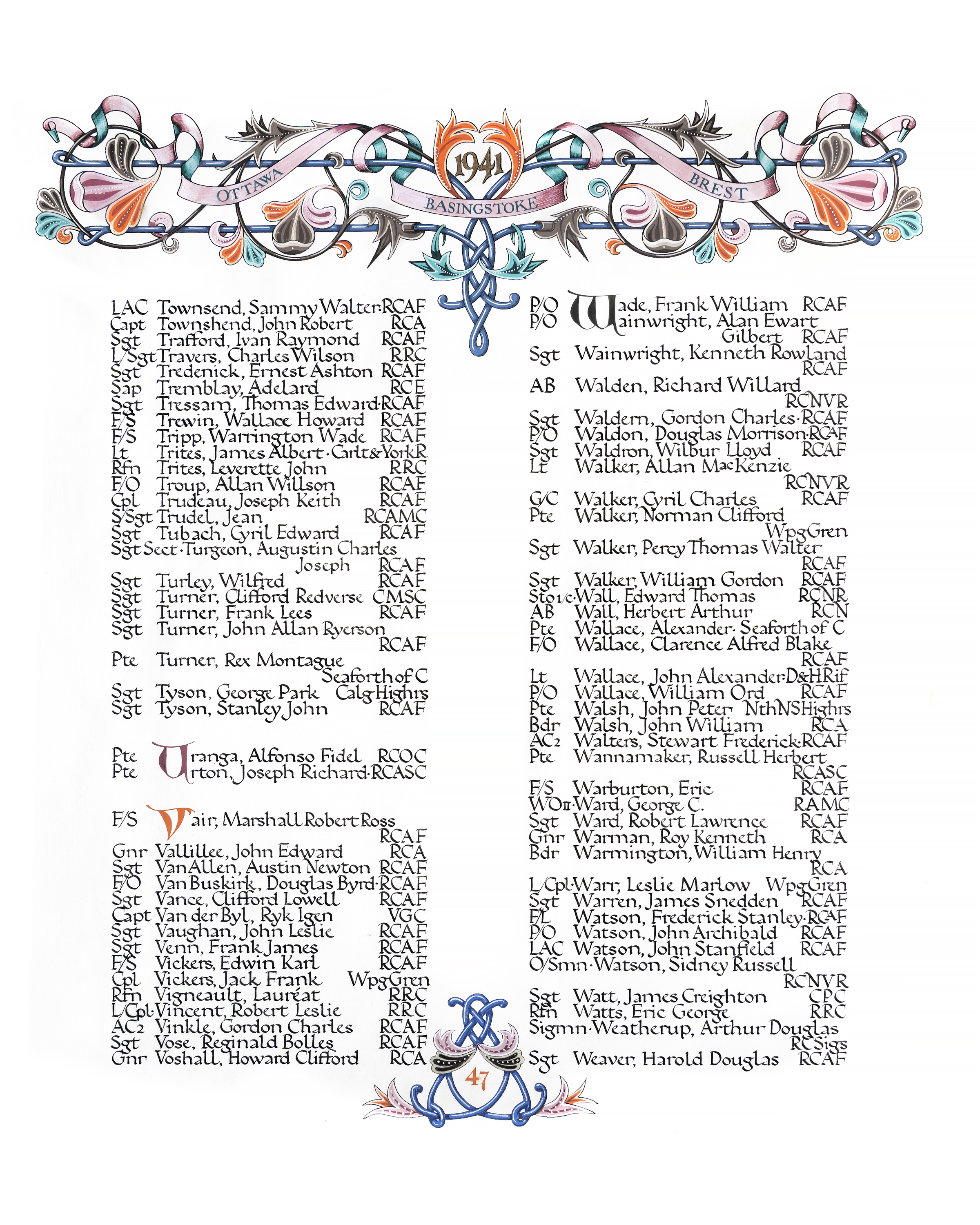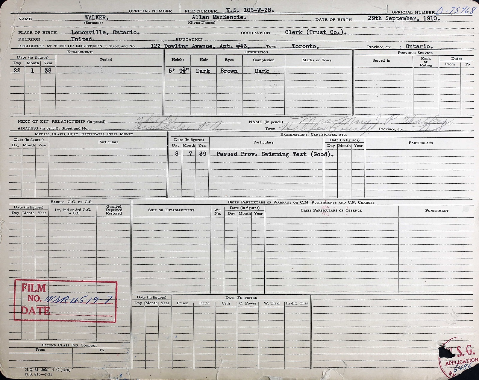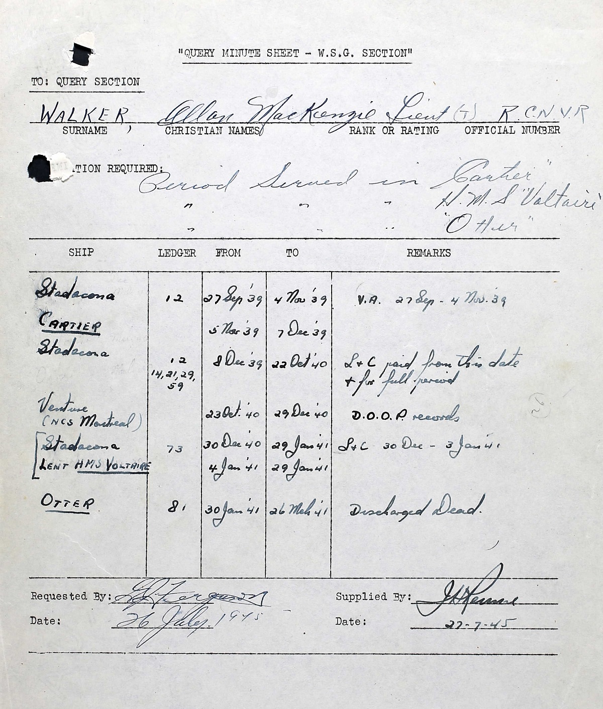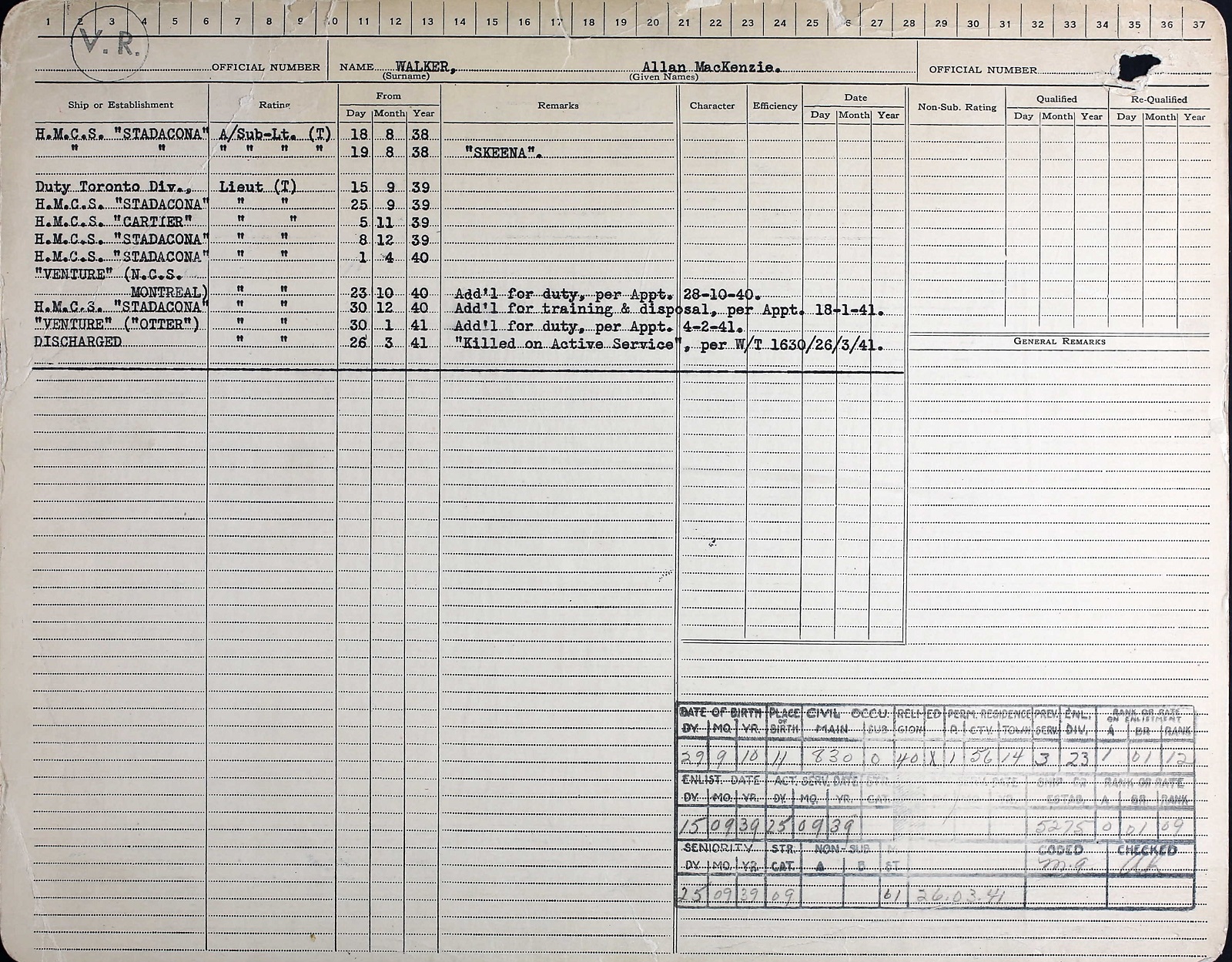 Ships served in: TORONTO DIVISION RCNVR - Enlisted 22 Jun 1938 as an A/SLt, RCNVR HMCS STADACONA - Appointed to STADACONA 18 Aug 1938 as a A/SLt, RCNVR for training HMCS STADACONA - Loaned to HMCS SKEENA 19 Aug 1938 for training (end date unknown) HMCS STADACONA - Appointed to STADACONA 01 Sep 1939 Add'l for Duty with Staff Officer (Intelligence) as a Lt, RCNVR TORONTO DIVISION RCNVR - Appointed to TORONTO DIV RCNVR 15 Sep 1939 as a Lt, RCNVR HMCS STADACONA - Appointed to STADACONA 25 Sep 1939 as a Lt, RCNVR HMCS CARTIER - Served in CARTIER 05 Nov 1939 - 07 Dec 1939 as a Lt, RCNVR HMCS STADACONA - Appointed to STADACONA 08 Dec 1939 as a Lt, RCNVR HMCS VENTURE - Add'l for NCS MONTREAL - Appointed to NCS MONTREAL 23 Oct 1940 as a Lt, RCNVR HMCS STADACONA - Appointed to STADACONA 30 Dec 1940 Add'l for training and disposal as a Lt, RCNVR HMS VOLTAIRE (HMCS STADACONA for) - Loaned to VOLTAIRE 04 Jan 1941 - 29 Jan 1941 as a Lt, RCNVR HMCS OTTER - Appointed to OTTER 30 Jan 1941 as a Lt, RCNVR