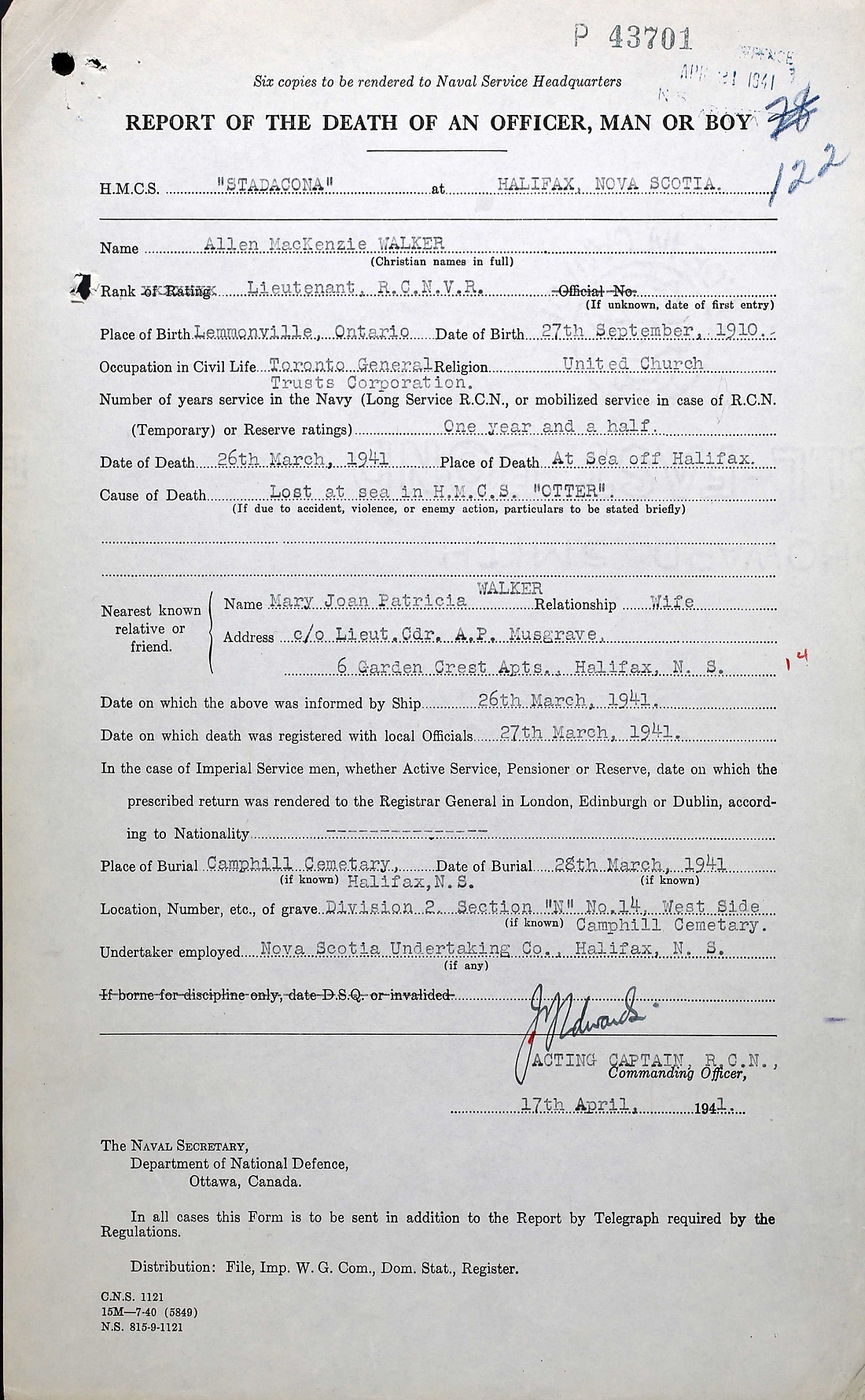 Lieutenant Alan Mackenzie Walker age 30, of Toronto, was the first officer aboard the converted yacht HMCS Otter. He was the son of Rev. and Mrs. W. W. Walker of Toronto. His widow is the former Miss Joan Nutall also of Toronto. Lieutenant Walker, who wore the stripes of the RCNVR; he joined the senior service in 1938 and took his training in Halifax in 1938 and the following year. He has seen service aboard ships of war with both the Royal Navy and the Royal Canadian Navy.